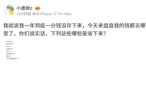 你这?小虞姬深夜晒25年花销:网恋被骗80W 一年到底一分没存