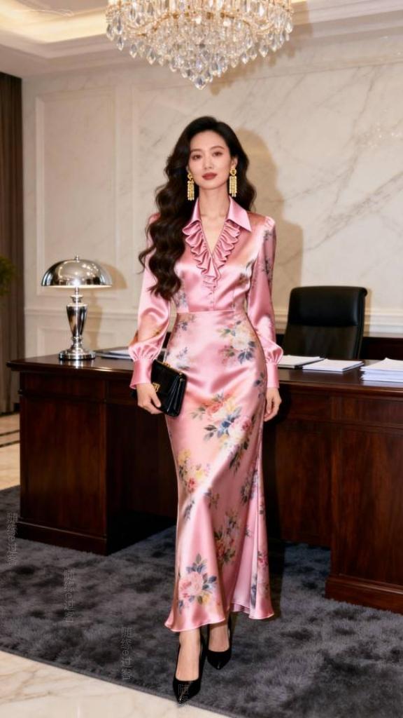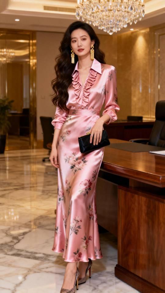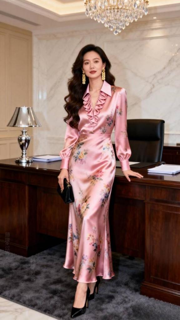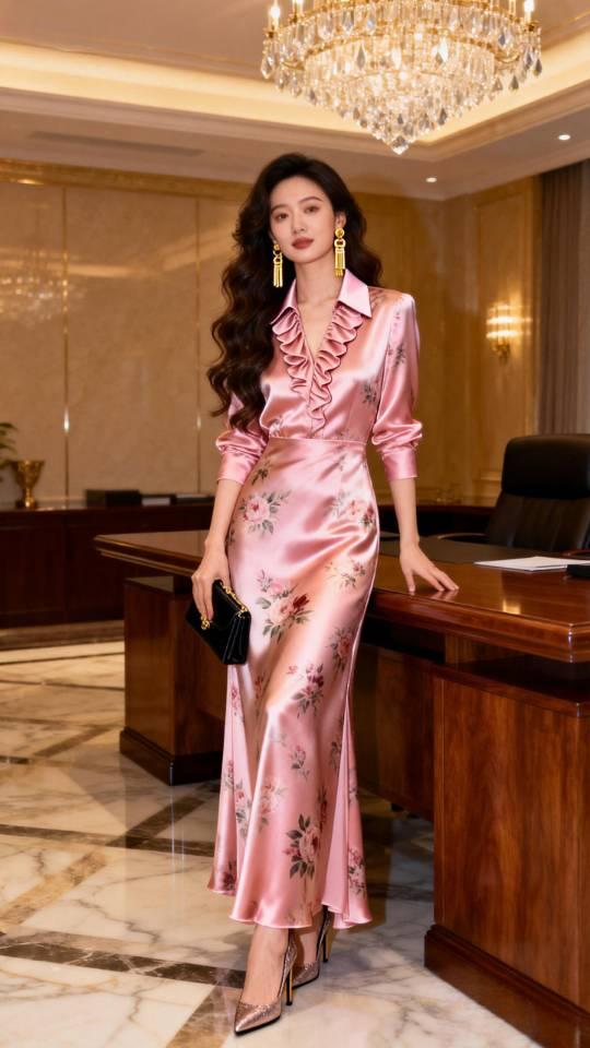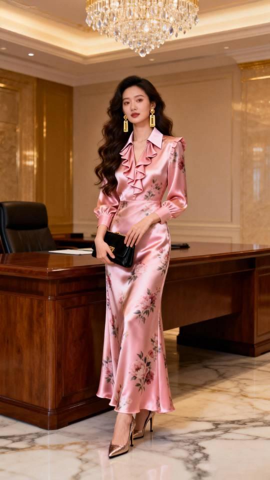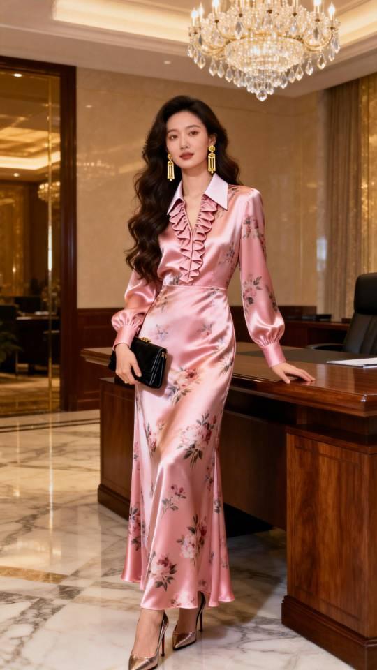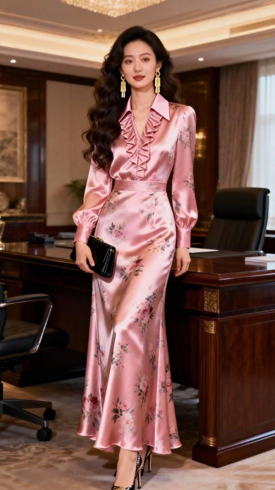 身穿粉红色真丝缎连衣裙女子办公室写真。连衣裙 美女壁纸