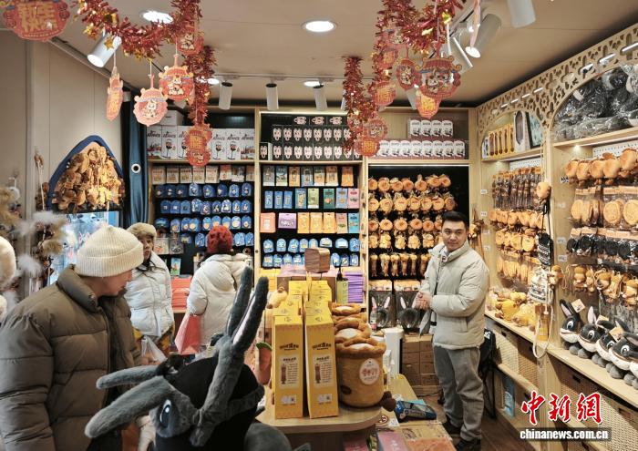 1月12日,在位于乌鲁木齐市的新疆国际大巴扎内,游客在阿凡提文创专卖店挑选商品。苟继鹏摄