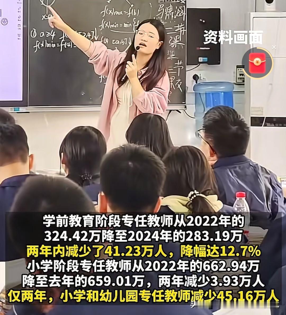 最近,“小学和幼儿园老师2年减少45万”上了热搜。老师数量少了,说明上学的孩子少了,每少一个老师,就会少一大群孩子,这就是出生人口断崖式下跌的连锁反应。很多网友埋怨道:“养孩子成本太高,工资支撑不了孩子,另外就是孩子安全无保障,不敢生了。” 2016年至2023年,我国新生儿数量从1786万骤降至902万,幼儿园、小学阶段的生源规模率先收缩(小学2023年达峰),教师需求随生源减少而大幅下降。再者就是乡村小规模学校(如浙江嵊泗某村小6个年级仅19名学生)因难以维持运转收缩,乡村教师持续流失,这类教师失业的颇多。 最后就是教师本来就严重过剩,一个学校要不了多少老师,很多地方都是扩大学校规模,增加教师岗位,解决教师过剩问题。但问题是老师太多,学生不需要这么多老师来教呀!如果教育不卷的话,老师的收入会大打折扣,只能另求他路。