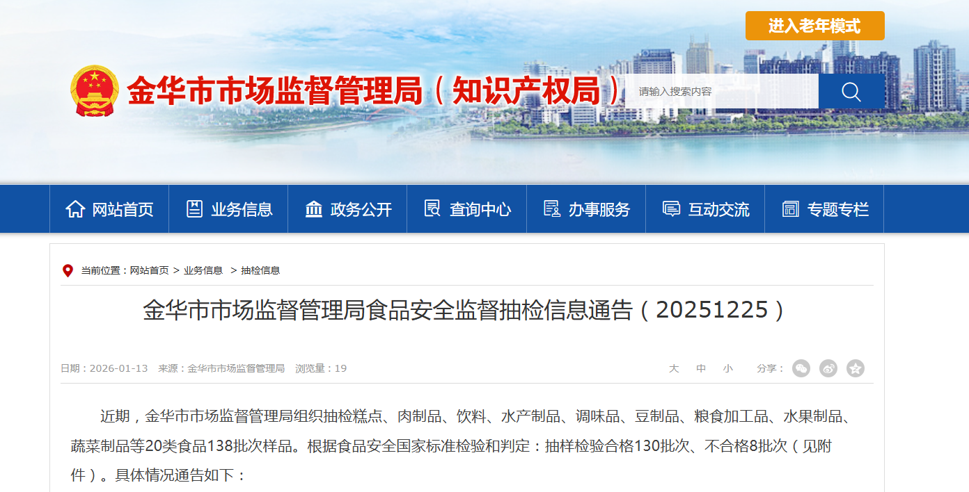 近期,金华市市场监督管理局组织抽检糕点、肉制品、饮料、水产制品、调味品、豆制品、粮食加工品、水果制品、蔬菜制品等20类食品138批次样品。根据食品安全国家标准检验和判定:抽样检验合格130批次、不合格8批次(见附件)。具体情况通告如下: