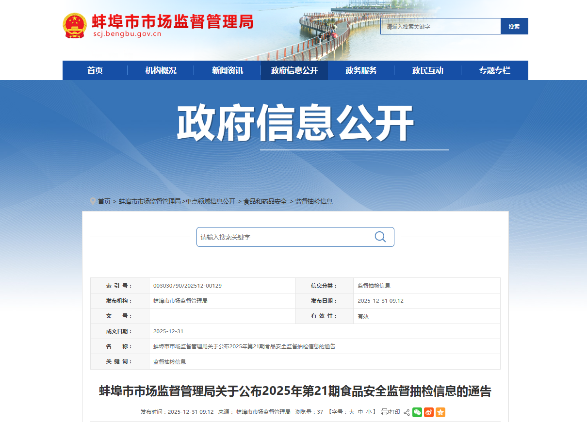 安徽省蚌埠市市场监督管理局关于公布2025年第21期食品安全监督抽检信息的通告
