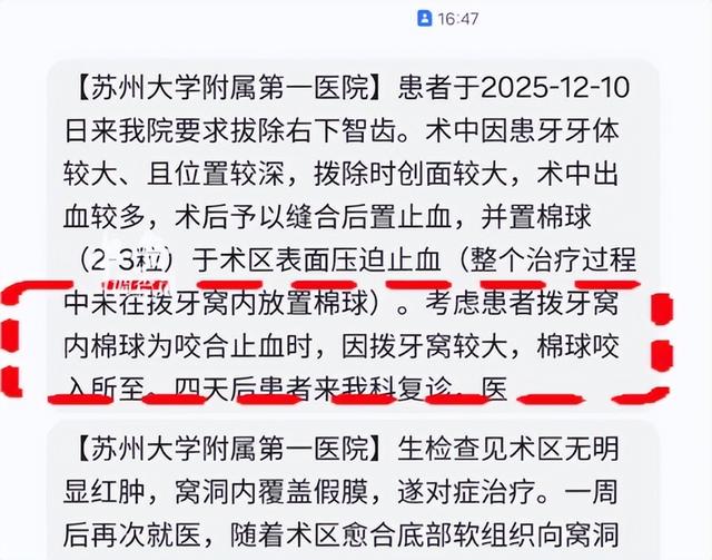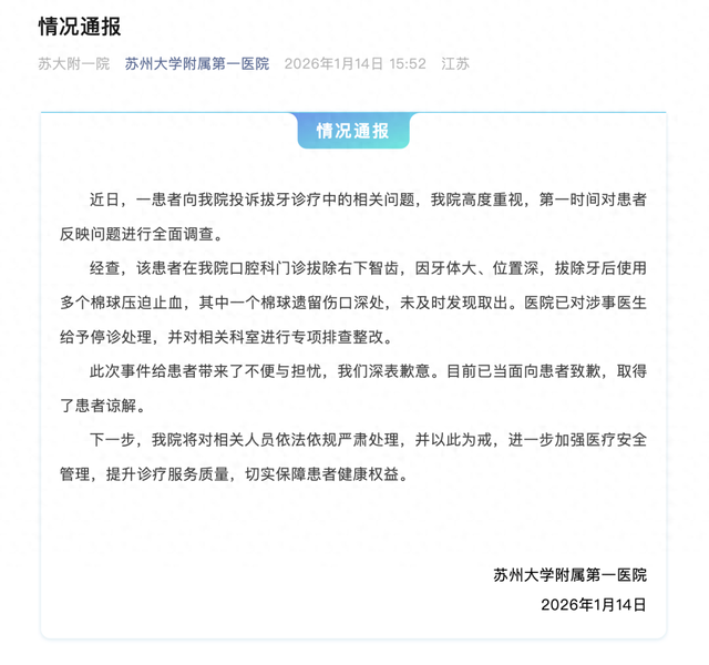 经查,该患者在我院口腔科门诊拔除右下智齿,因牙体大、位置深,拔除牙后使用多个棉球压迫止血,其中一个棉球遗留伤口深处,未及时发现取出。医院已对涉事医生给予停诊处理,并对相关科室进行专项排查整改。