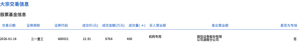 1月14日,三一重工大宗交易成交400万股,成交额8764万元,占当日总成交额的4.03%,成交价21.91元,较市场收盘价22.24元折价1.48%。