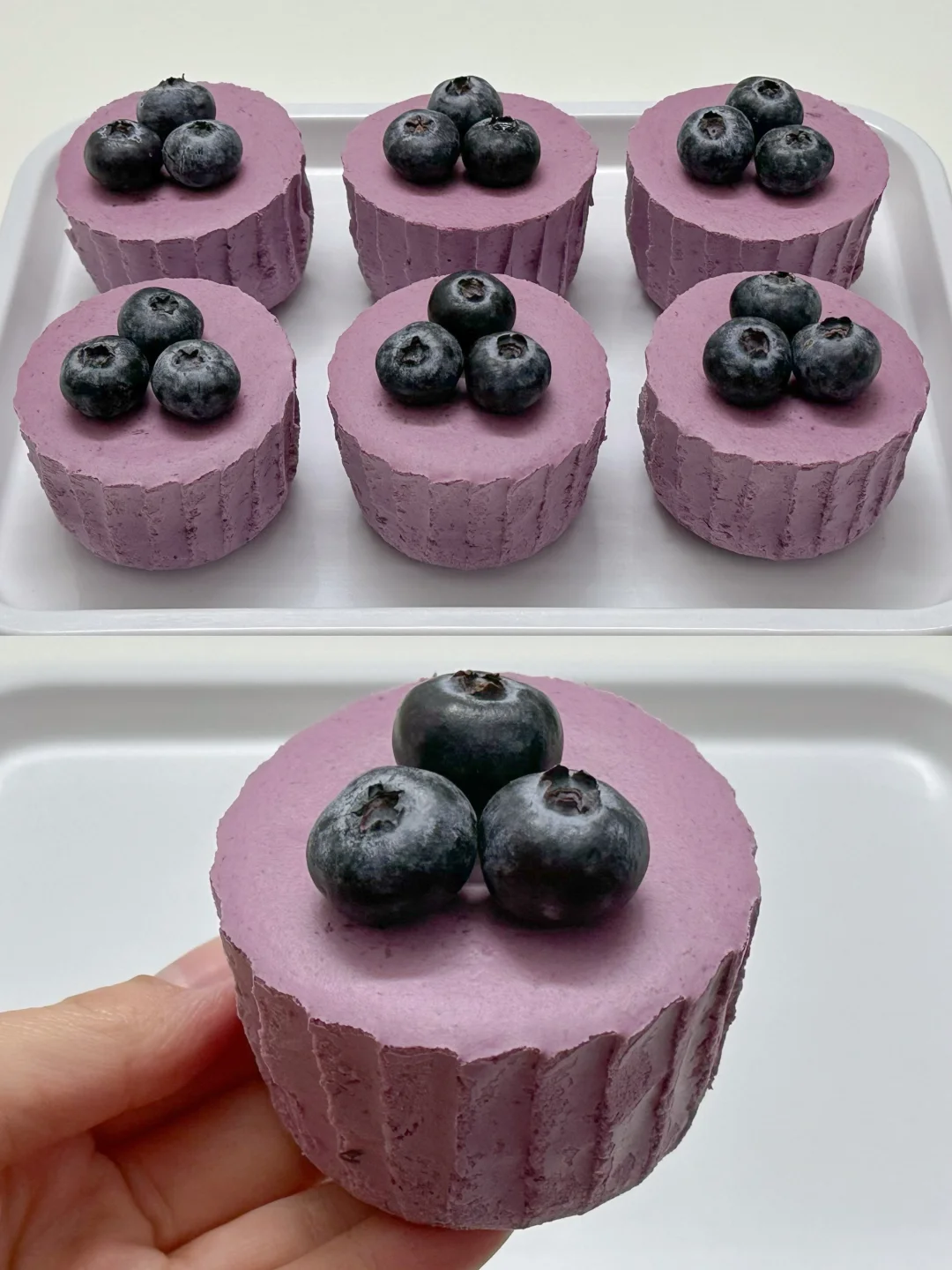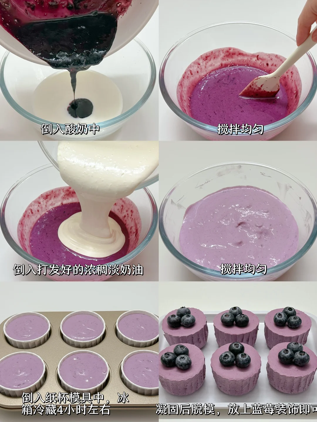 3️⃣泡软的吉利丁加在煮好的蓝莓酱中搅拌融化,倒入酸奶中搅拌均匀,倒入打发好的浓稠淡奶油搅拌均匀,挤入纸杯模具中,冰箱冷藏4小时左右,凝固后脱模,放上蓝莓装饰即可。