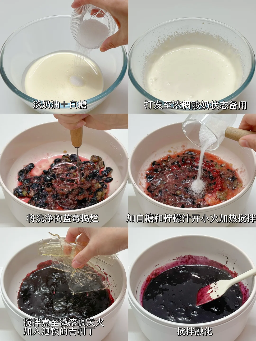 2️⃣将洗净的蓝莓捣烂,加白糖和柠檬汁开小火加热搅拌煮至微浓稠关火。