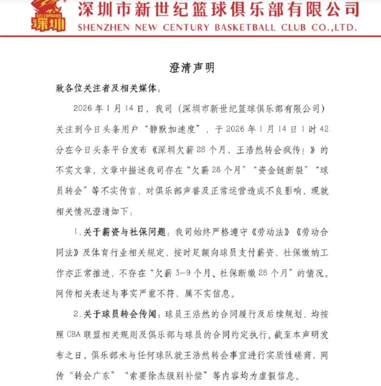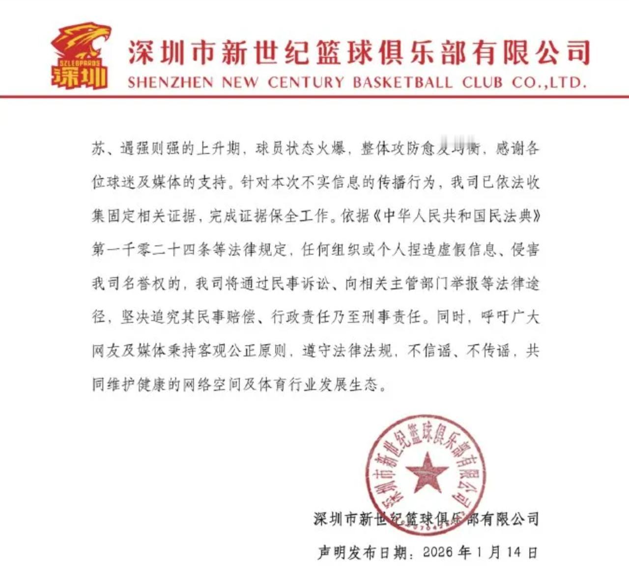 忍无可忍,深圳队发布声明! 在近段时间,深圳队的表现,可以说是让人眼前一亮,让人没有想到,深圳队更换了主教练之后,球队成绩是步步高升,不断创造了佳绩。他们在击败CBA夺冠大热门北京队之后,接下来,又击败了夺冠大热门上海队,成为了CBA的“巨人杀手”。可以说,深圳队取得如此佳绩,与主教练郑永刚是息息相关的。 不过,随着深圳队不断取得好成绩,也是树大招风呀,在近日,有一些自媒体人,就开始给深圳队造谣,说什么深圳队处于欠薪状态,球员已经几个月没有发工资了。说什么,球队锋线球员王浩然要离队,深圳队将会与广东队进行交易。 说什么深圳队的经营出现了严重的问题,球队资金链断了,不能引进外援了,只能以全华班阵容参赛了…… 总之,在近段时间,关于深圳队的各种传闻不断!似乎就像是一件没完没了的事情。 面对网络上的各种传言,深圳队也是忍无可忍,正式发布了声明,对网络上的各种传言,各种造谣,进行了说明,进行了澄清! 1、深圳队球员工资按时支付,合理合规。 2、王浩然现阶段完全没有转会的计划。 3、深圳队运营一切正常,资金没有任何问题。 与此同时,深圳队表示已经对相关的造谣者进行取证,接下来,将会对造谣者进行依法追究责任。同时,也是希望大家不要传谣、不要信谣! 实话实说:对于如此造谣的行为,真的让人感到失望,作为CBA的球迷,有自己的主队,合情合理。支持自己的主队,也是合情合理,没有任何问题。但是,为了变相支持自己的主队,去诋毁对手,去制造谣言,这样的行为,真的是可耻。 在此,笔者也是支持深圳队,向造谣者依法追究责任!毕竟,网络也不是不法之地,每一个人都要尊重事实,要实事求是。 与此同时,也是希望深圳队能够再接再厉,不断打出好的表现,不断以弱克强,打出自己的风采,打出深圳队的气势。加油!