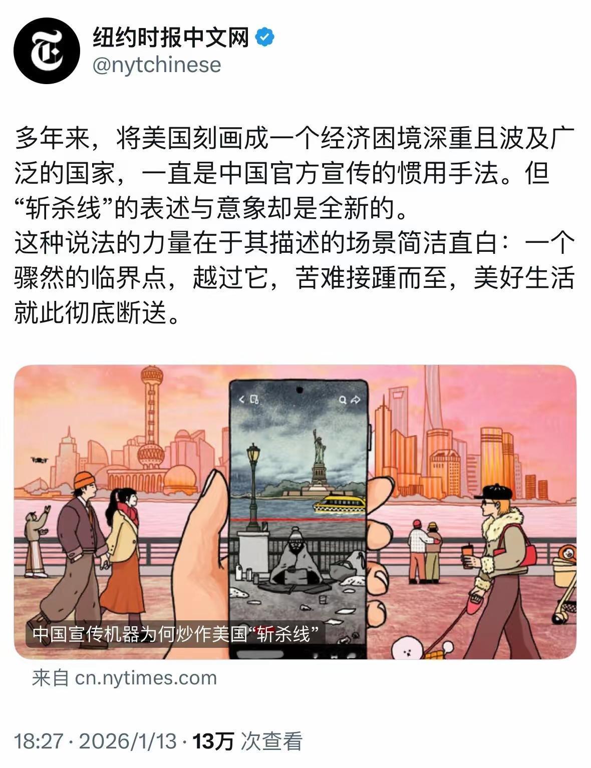 岁末年初因斩杀线引爆互联网的“牢A”,因一篇文章“逃回”祖国了。 2026年1月13日的一篇袁莉的文章,直接点名牢A。牢A在自己的群里写道:“跑路了,细软都不要了。”直接买票回国了。 据网友爆料,牢A目前已经平安落地。 为啥牢A在得知自己被袁莉点名之后,要急于回国呢?如果熟知美国人被自杀,被车祸的人,一定会知道为何。 最近一例案例就是“纽约蓝蓝”,一位华裔女作家——张兰。她在2020年3月新冠疫情期间,以《疫情中的纽约人》为标题,发表系列日记,记录纽约疫情下的真实生活,获得了极高的关注度。 结果2020年3月27日,张兰在纽约因一场突发车祸不幸当场去世,纽约日记因“车祸”戛然而止。 估计是纽约蓝蓝的结局,让牢A感受到了危机。毕竟整个东西方的舆论场因“斩杀线”爆火,而且西方民众也开始聚焦了这一存在已久却鲜为人知的生命线,以至于西方大媒体纷纷口诛笔伐。 不得不说袁莉在抹黑、造谣、反华方面一如既往地不遗余力,更是把在美留学的牢A塑造成国家喉舌,把一个留学生日常生活观察的结果强行扣上意识形态的帽子,这种行径可恶至极。 有网友说,牢A这波在舆论场的作用相当于几个师的作用。更是把美国几十年塑造的高大上形象,打碎得一地。这也难怪以袁莉为代表的这些高华那么记恨他了。 大家讨论下牢A出于自我保护突然回国,有必要吗?