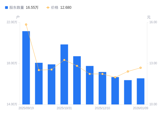 日期A股户数(户)流通A股户均持股数(股)户均持股市值(万元)2025-12-311636626554.368.132025-12-191666176438.117.712025-12-101716306250.077.642025-11-281775356042.187.392025-11-101870175735.847.352025-10-311984335405.857.162025-10-201790745990.267.522025-09-301805705940.637.432025-09-192114295073.578.042025-09-101569416835.059.52