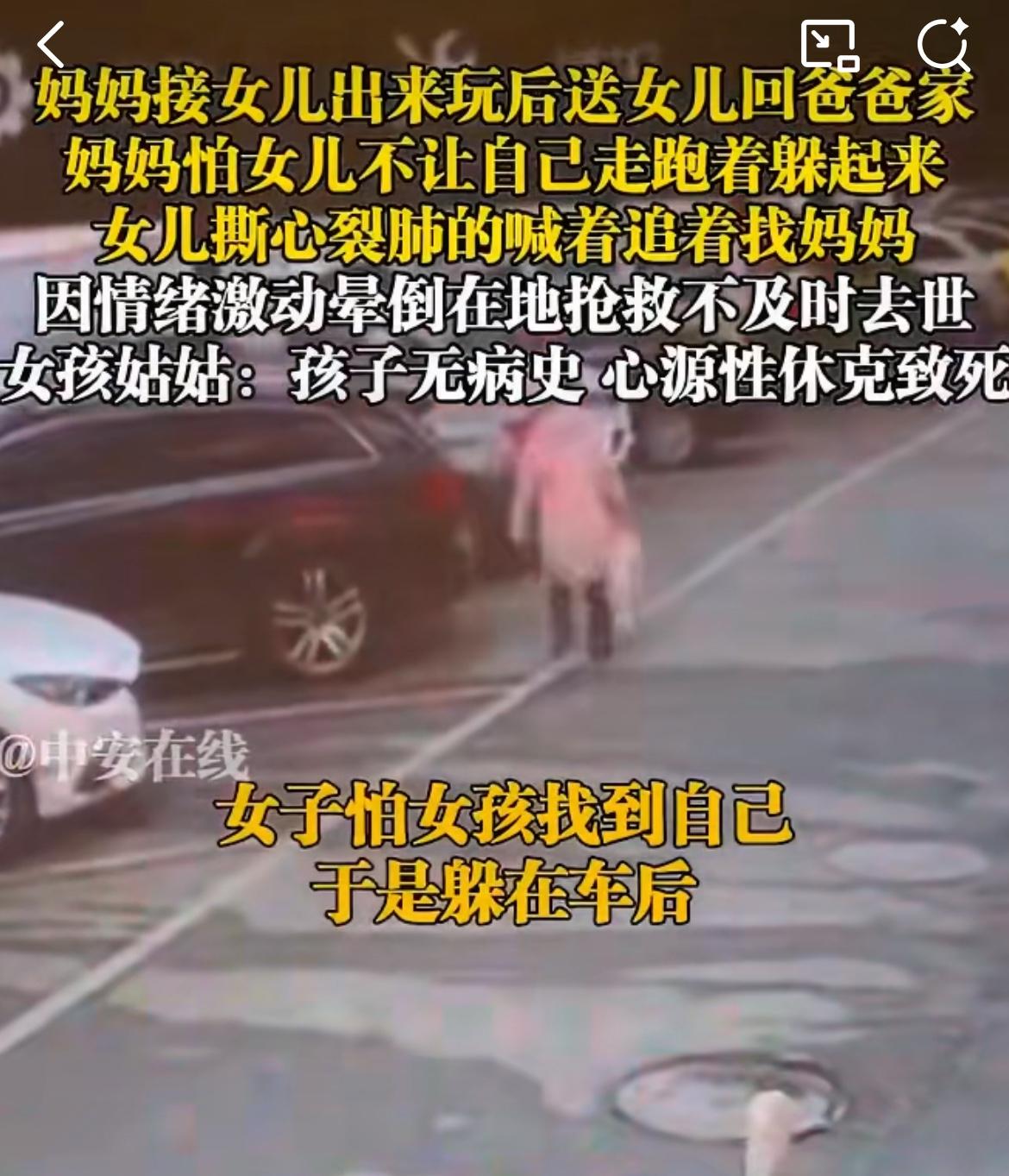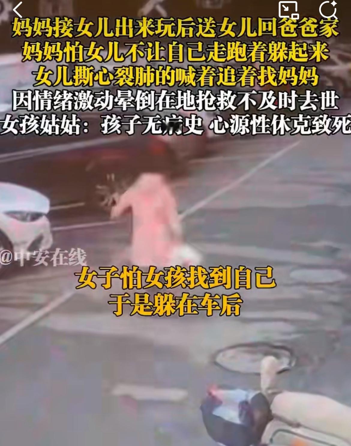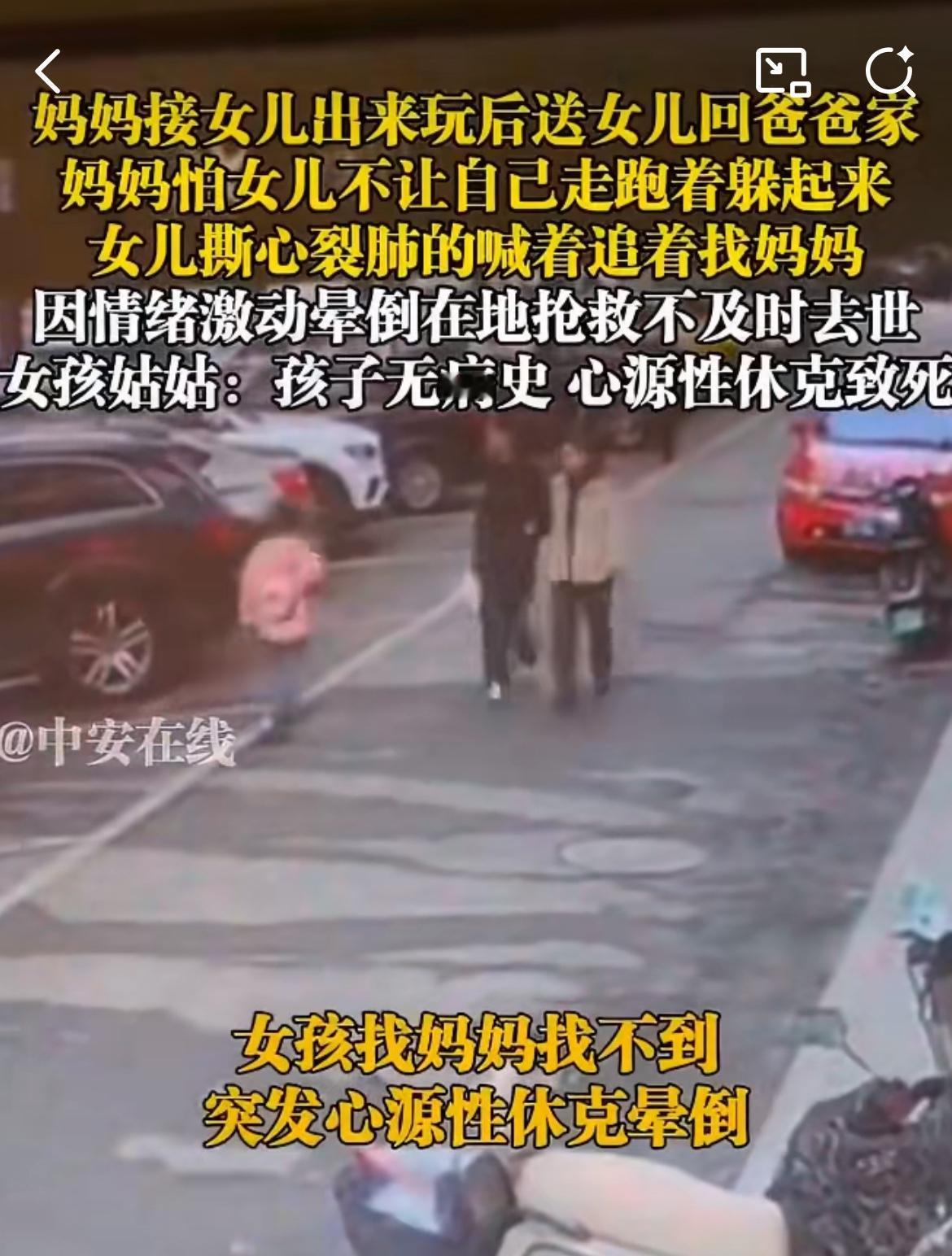 太痛心了,湖南一9岁女孩追妈妈晕倒身亡,从视频看小女孩撕心裂肺的喊叫,情绪非常激动,引起心源性休克。孩子的爸爸和妈妈离婚了,和爸爸一起生活,妈妈带孩子出去玩,送回爸爸家,妈妈为了不让孩子找她,偷偷的走了,发现妈妈不见的女孩立即冲出大街寻找,大声哭喊,情绪过于激动,导致悲剧,倒在大马路上,如果当时要有懂急救的,也许还有救,可惜没有如果。男童死 孩子哭到昏厥