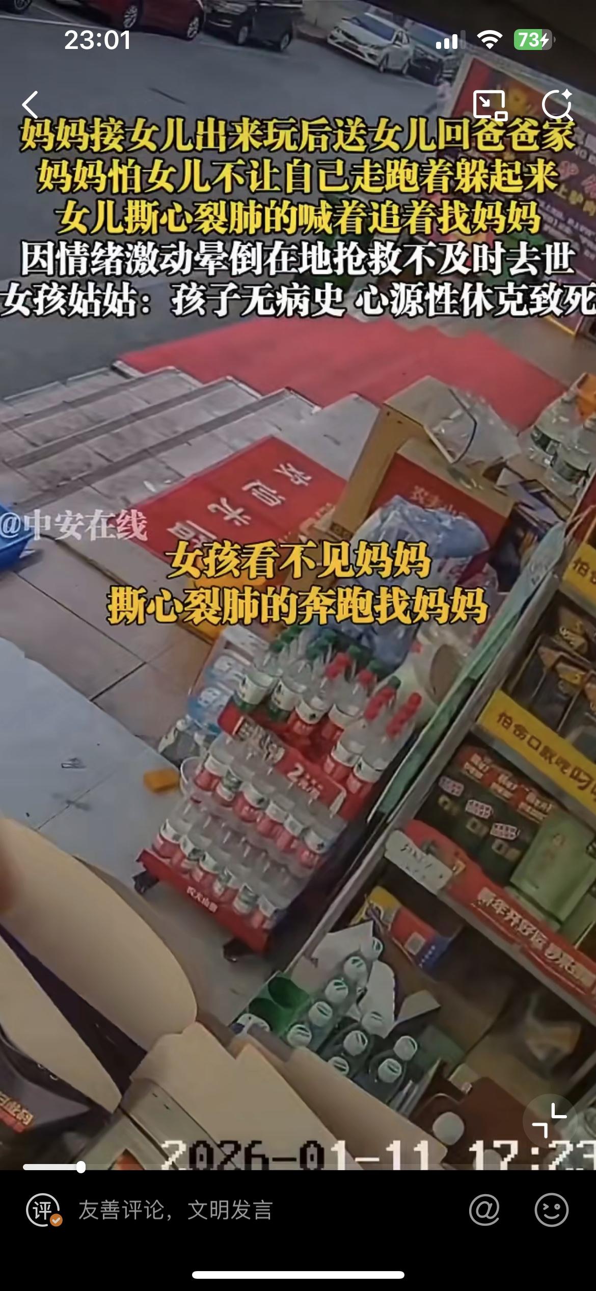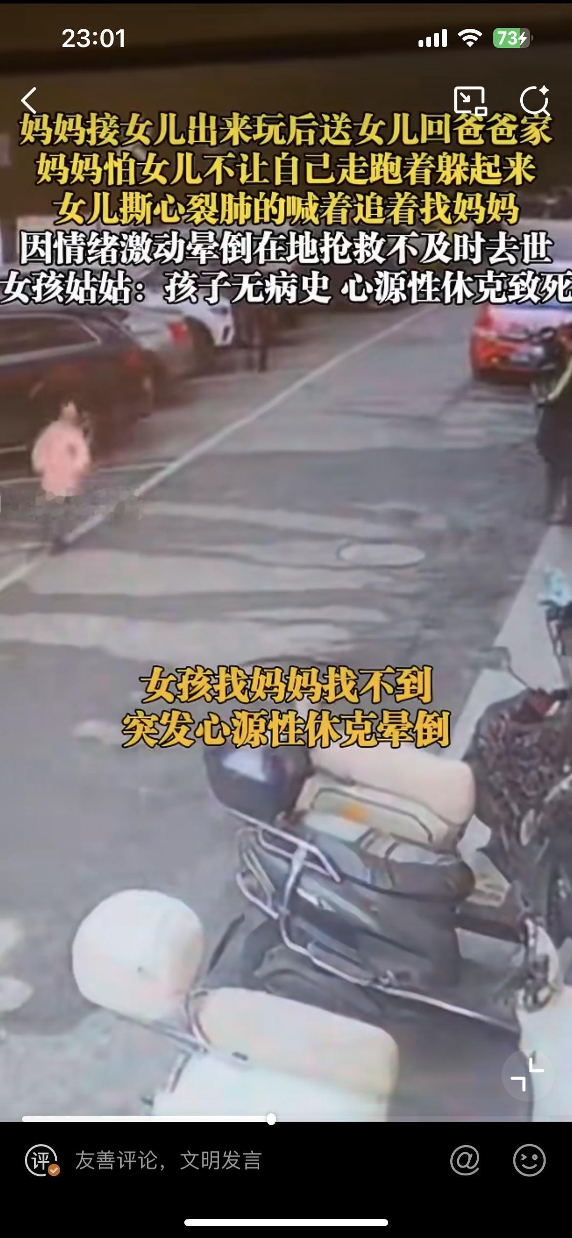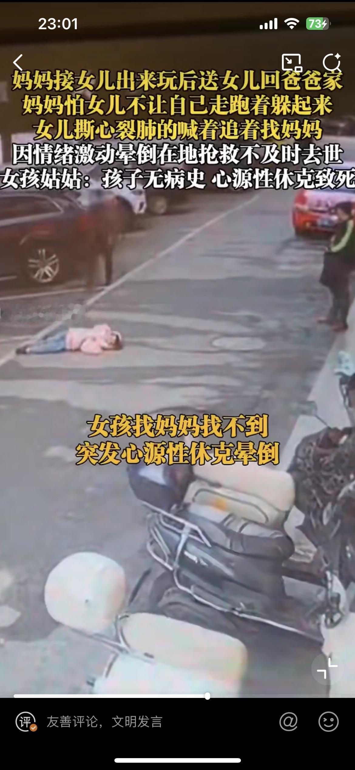 太痛心了,湖南一9岁女孩追妈妈晕倒身亡,从视频看小女孩撕心裂肺的喊叫,情绪非常激动,引起心源性休克。孩子的爸爸和妈妈离婚了,和爸爸一起生活,妈妈带孩子出去玩,送回爸爸家,妈妈为了不让孩子找她,偷偷的走了,发现妈妈不见的女孩立即冲出大街寻找,大声哭喊,情绪过于激动,导致悲剧,倒在大马路上,如果当时要有懂急救的,也许还有救,可惜没有如果。男童死 孩子哭到昏厥