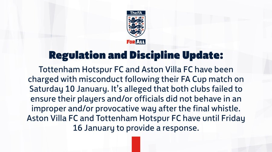 “热刺足球俱乐部和阿斯顿维拉足球俱乐部在1月10日星期六的足总杯比赛后被指控行为不当。两家俱乐部未能确保其球员及官员在终场哨响后没有不当及挑衅行为。阿斯顿维拉足球俱乐部和托特纳姆热刺足球俱乐部需在1月16日星期五之前作出回应。”