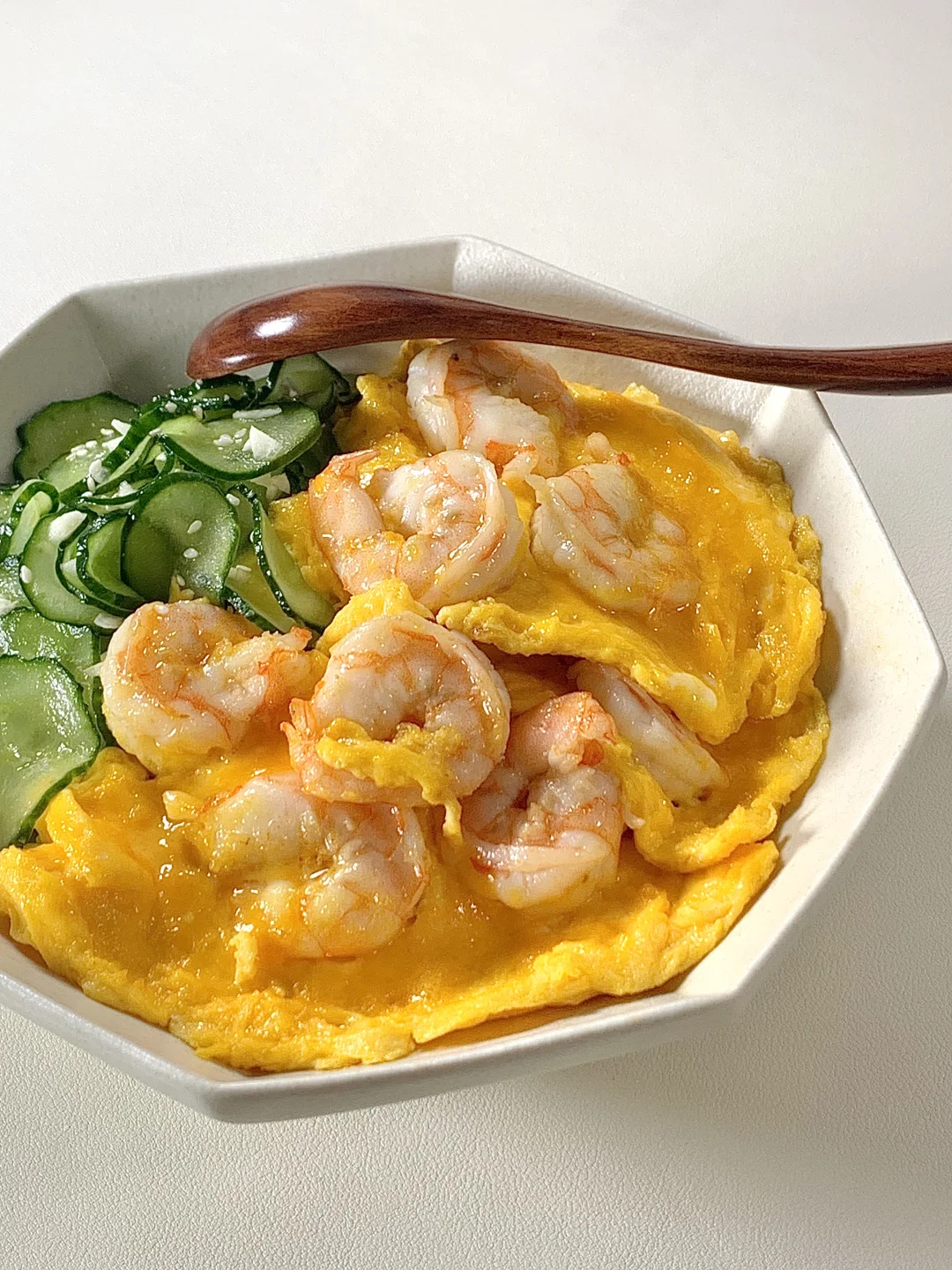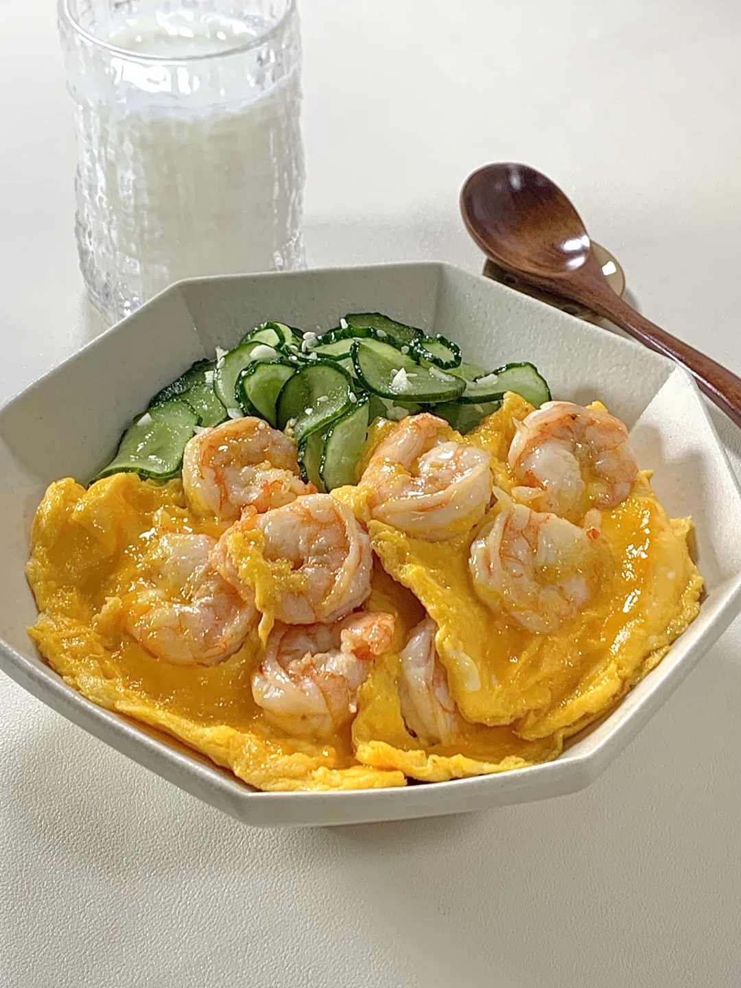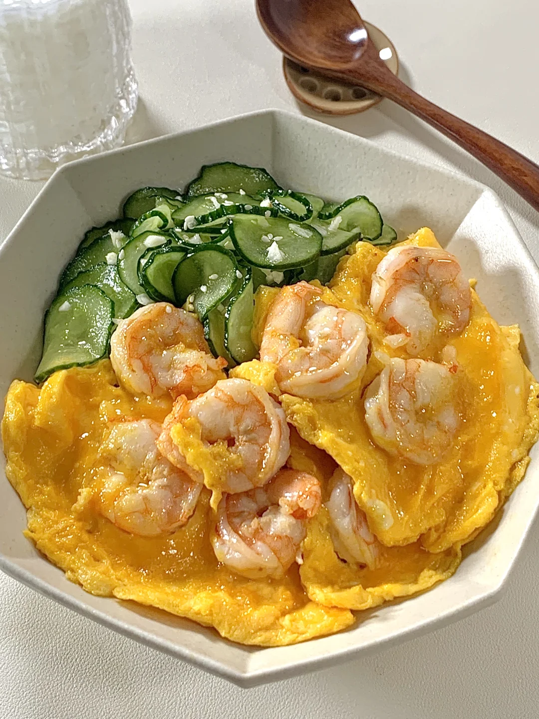 今日减脂餐吃虾仁滑蛋!巨鲜美😋 📝食材:虾仁、鸡蛋、黄瓜、一拳头米饭 🫕做法: 1️⃣黄瓜切片+少许盐杀出水份+1勺蒜未+1勺香油拌匀即可 2️⃣碗里打3个鸡蛋+1勺淀粉+少许盐水拌匀 3️⃣虾仁去壳+黑胡椒盐+姜片腌制10分钟 4️⃣起锅烧油倒入虾仁炒熟→淋上蛋液慢慢滑熟就可以出锅啦✅ 🍃装盘美美的开吃啦[色色R] 简单易做!姐妹们快来试试吧[派对R]