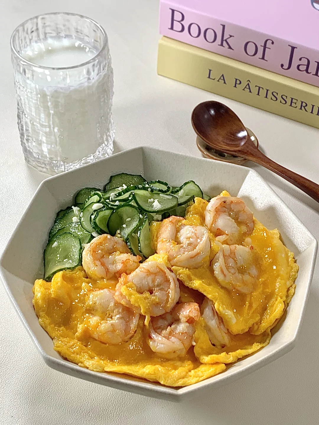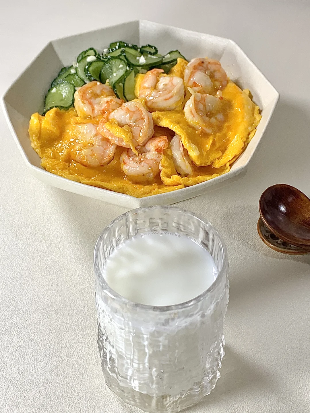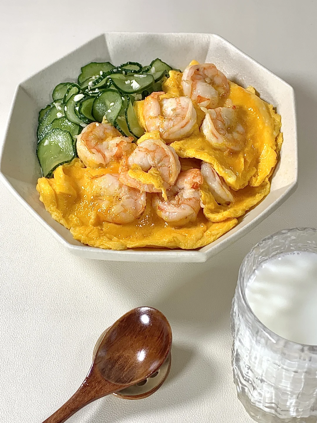 今日减脂餐吃虾仁滑蛋!巨鲜美😋 📝食材:虾仁、鸡蛋、黄瓜、一拳头米饭 🫕做法: 1️⃣黄瓜切片+少许盐杀出水份+1勺蒜未+1勺香油拌匀即可 2️⃣碗里打3个鸡蛋+1勺淀粉+少许盐水拌匀 3️⃣虾仁去壳+黑胡椒盐+姜片腌制10分钟 4️⃣起锅烧油倒入虾仁炒熟→淋上蛋液慢慢滑熟就可以出锅啦✅ 🍃装盘美美的开吃啦[色色R] 简单易做!姐妹们快来试试吧[派对R]