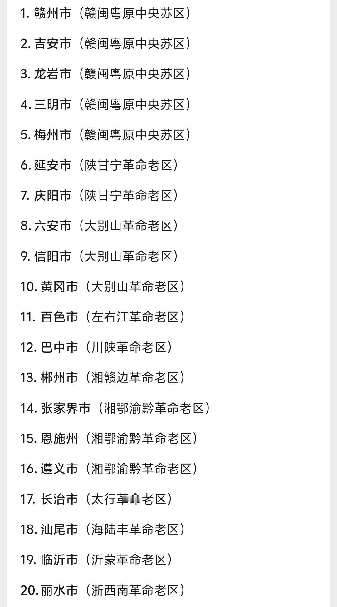 全国20个革命老区重点城市中赣州是老区振兴发展示范区,也是当之无愧的老大,可能发展的较好的就是赣州、延安、遵义、黄冈等地,但都存在发展的壁垒和困境,地理环境自然环境都不是很好,但其中人均最高的是龙岩,增速最快的是巴中,希望这些地方能够给予更多的扶持和政策,能够快速发展起来带领老百姓过上幸福小康生活。