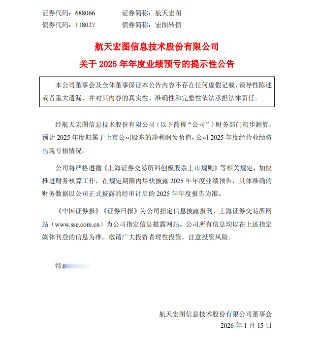 1月14日,航天宏图信息技术股份有限公司(688066.SH)披露业绩预亏提示性公告,预计2025年度归属于上市公司股东的净利润为负值,公司2025年度经营业绩将出现亏损情况。