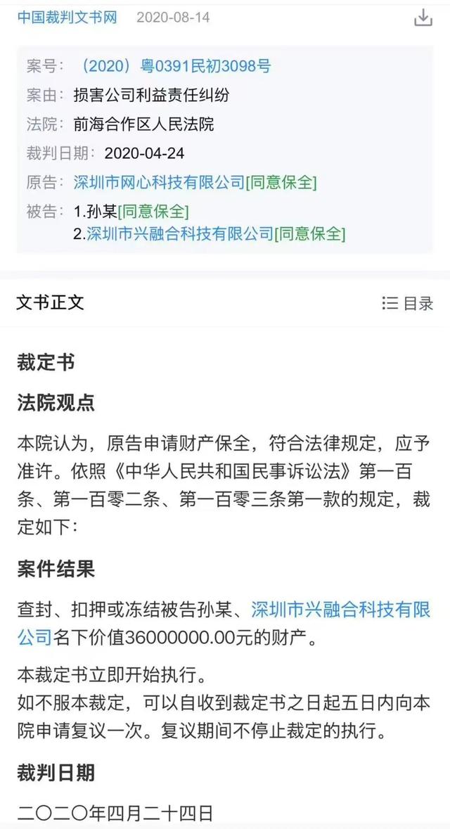 对于兴融合这家公司的现状,接近人士告诉第一财经记者,兴融合在公司管理层发生变动后就几乎不再运营了。2020年期间,在一起网心与孙某、兴融合的损害公司利益责任纠纷的案件中,法院原告网心申请了财产保全,兴融合有3000多万元的资金被前海合作区人民法院冻结。