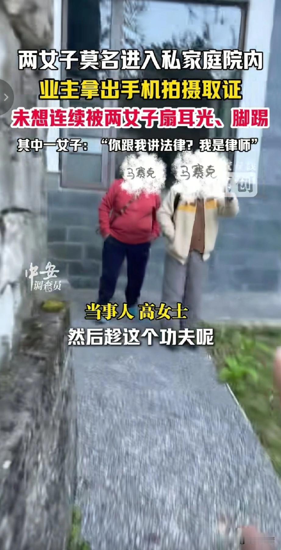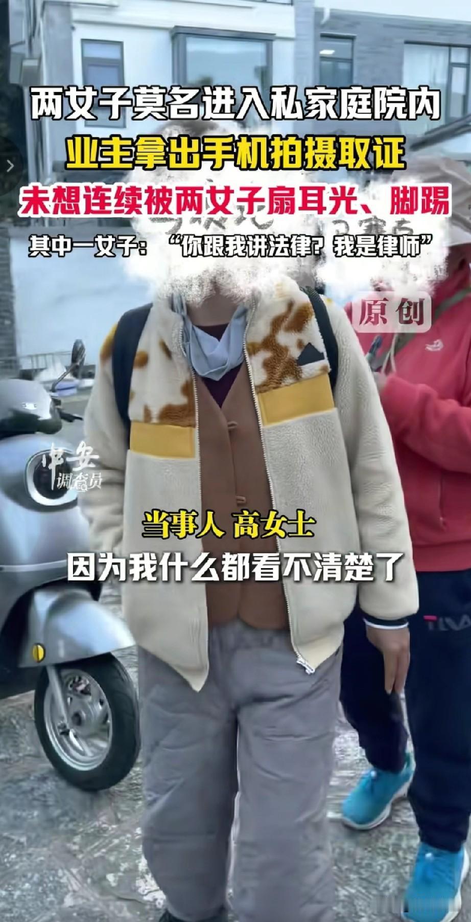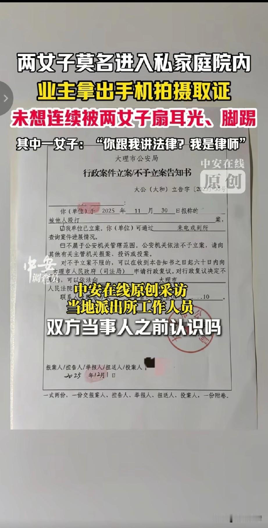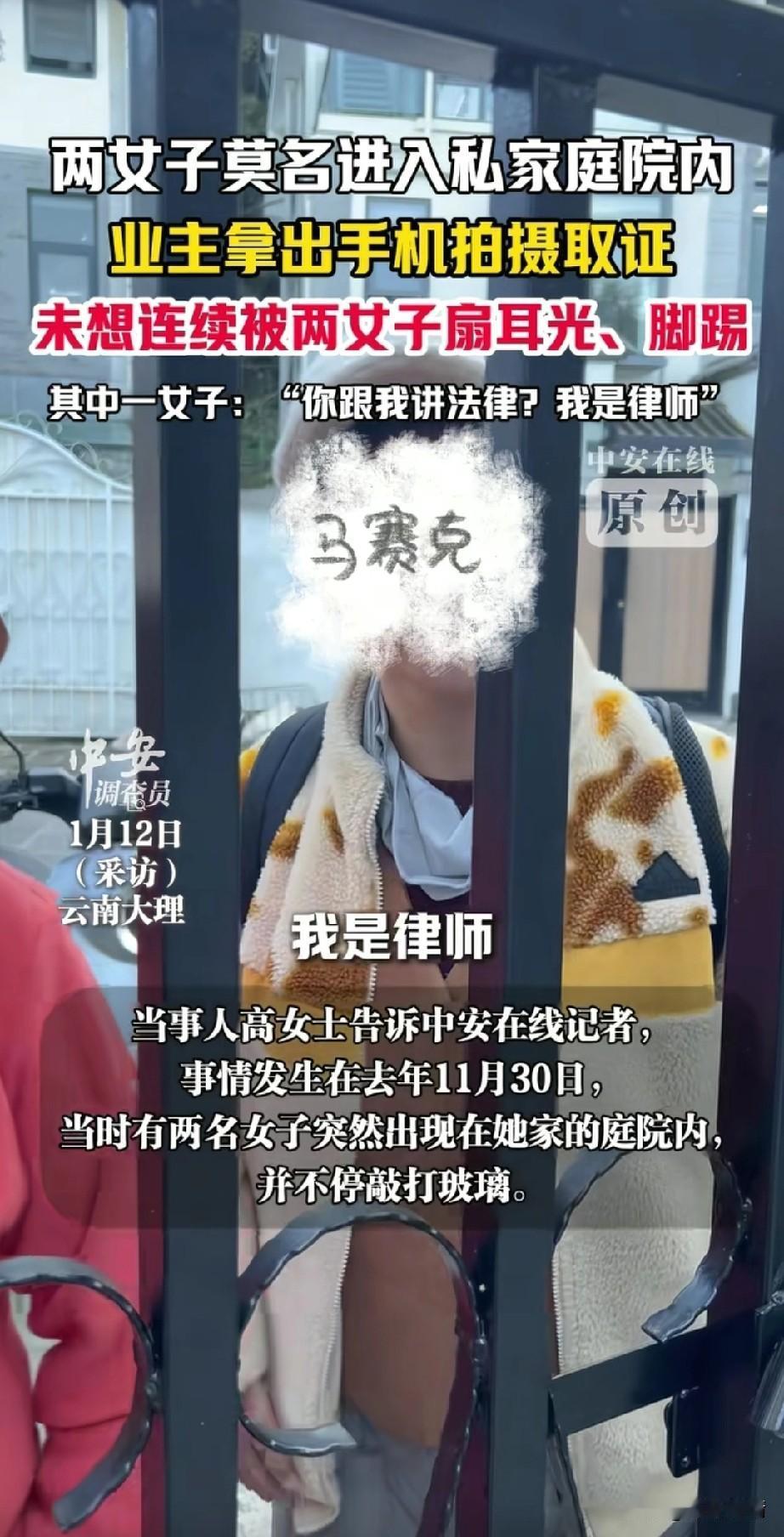 云南大理律师私闯民宅后续来了,律师和她的朋友大妈无任何处罚,叔叔表示不方便透露! 受害人高女士称,2025年11月30号,她在家参加工作会,突然听到自己庭院嘈杂,于是她就去看看出了什么事情! 结果令她意想不到的一幕发生了,两名大妈撬锁进入她的庭院,并且敲打她的玻璃, 意思就上前制止了她们,询问她们为什么要私自进入别人的庭院?结果白衣大妈咄咄逼人! 大喊大叫说:你给我讲法律,我就是律师,还私闯民宅,住宅是指房屋,我们又没有进入房屋,这是你的家怎么了? 更让人生气的是大妈还表示自己是善意的走进你家院子,敲一下你家玻璃怎么了?这是人说的话吗?别人的家不应该让你异参观吗?这逻辑简直无法让人理解! 听听这是一个律师大妈讲的话,知法犯法,丝毫不讲理,简直给律师行业丢脸。 随后更过分的一幕发生了,由于女业主拿起手机录像留证据,没想到这激怒了白衣大妈,大妈直接上去扇了一耳光, 两方发生了争吵,结果旁边的红衣大妈又上去补了一耳光,将女业主的眼镜打掉,女业主下意识的去捡眼镜, 结果两个人直接趁机将她推倒在地,并且对她拳打脚踢,还对她吐了口水,这简直是羞辱对方! 随后女业主进行了报警,叔叔处理的结果让人意外,会对两位大妈做任何处理,并给予女业主不予立案通知书,1号报的警,如今没有音讯! 女业主气愤的表示,我们作为普通老百姓,面对法律工作者的施暴,难道就只能忍着吗?这话说的让人很生气! 有记者去采访当地派出所,结果叔叔表示,不方便透露,电话里我也不知道你是谁,记者表示可以报给他记者证编,叔叔直接表示查不到。 记者直接表示,记协的网站都可以查到,并且网上到处都有,叔叔自己只有公安网,没有外网,这话简直是骗3岁小孩,那记者都逗笑了,记者说你们派出所都没有外网吗?叔叔的一声嗯让人气愤! 很多网友表示没有想到大理这么乱,自己本来想去大理旅行,也不敢了!大理文旅这会可能慌了,由于舆论持续发酵,当地叔叔也表示介入处理,但并没有给予结果! 受害女士都觉得离谱,当天录完笔录,两位大妈跟没事儿人似的直接就走了,直到1月11号才拿到立案通知书,自己被两位大妈打的软骨挫伤,医院出具了检查结果!这么严重就没人管,想想真的可怕! 大家对于大理律师大妈私闯民宅殴打她人,这事怎么看?不妨聊一聊! 大理大理旅游 大理私闯民宅 律师违法