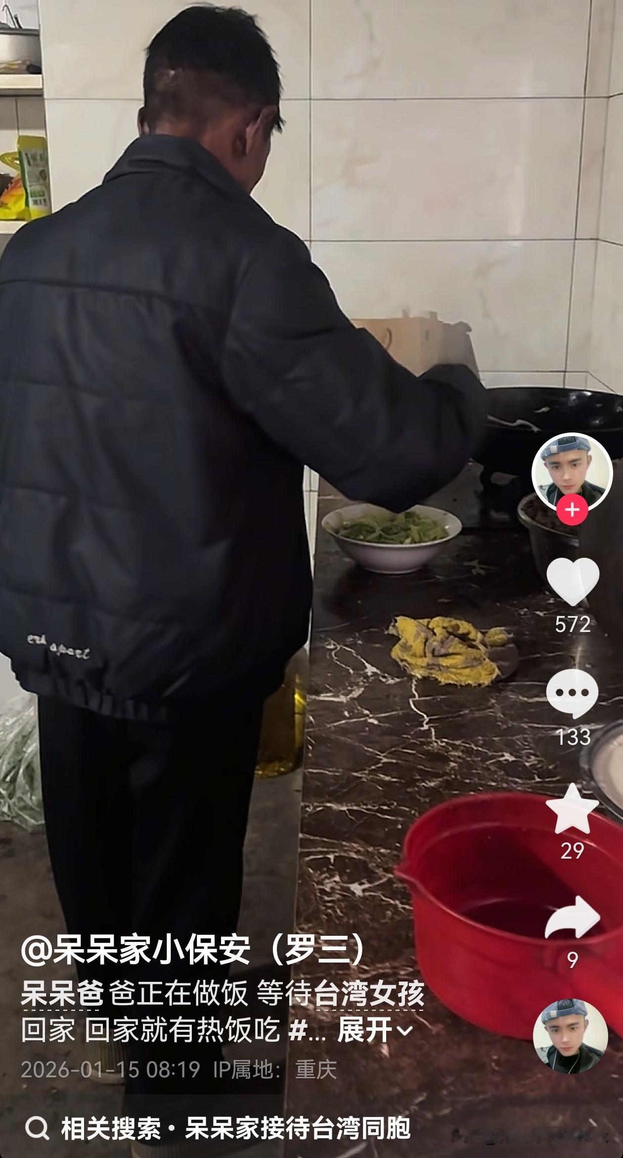 呆呆真的要迎接台湾同胞了, 今天呆呆家的小保安更新视频, 呆呆的爸爸妈妈一大早就开始准备, 打扫,做饭,一直在忙, 用最好的一面,最温暖的一面展现给台湾同胞。 小保安问呆呆爸妈,台湾女孩回家你们欢不欢迎,两个老人家笑着说,欢迎欢迎!热烈欢迎他们回家! 简单的一句话,“回家”两个字太暖心了。国台办提到有台湾同胞要去呆呆家吃刨煮汤,这事就不是重庆合川的事了,已经上升到另一个层面了。 相信等台湾的女孩们踏进门,喝上一碗滚烫的刨猪汤,尝到一口地道的腊肉,就会明白,这里从来不是陌生的远方,而是温暖的家。 期待海峡两岸同胞围坐一起团圆的画面!