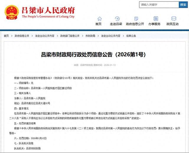 1月13日,吕梁市财政局发布行政处罚信息公告(2026第1号),吕梁市第一人民医院因在医疗园区搬迁项目中化整为零规避公开招标,被责令限期改正并给予警告。