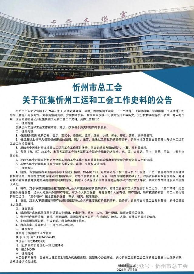 忻州市工人文化宫将于2026年5月1日正式对外开放。届时,内设忻州工运馆、"三个精神"(劳模精神、劳动精神、工匠精神)纪念馆(暂称)同步开馆。为丰富馆藏资源,完整传承史料,全面真实反映、记录好忻州工运历史,充分发挥两馆存史、资政、育人的作用,现面向全社会公开征集忻州工运和工会工作史料,具体公告如下: