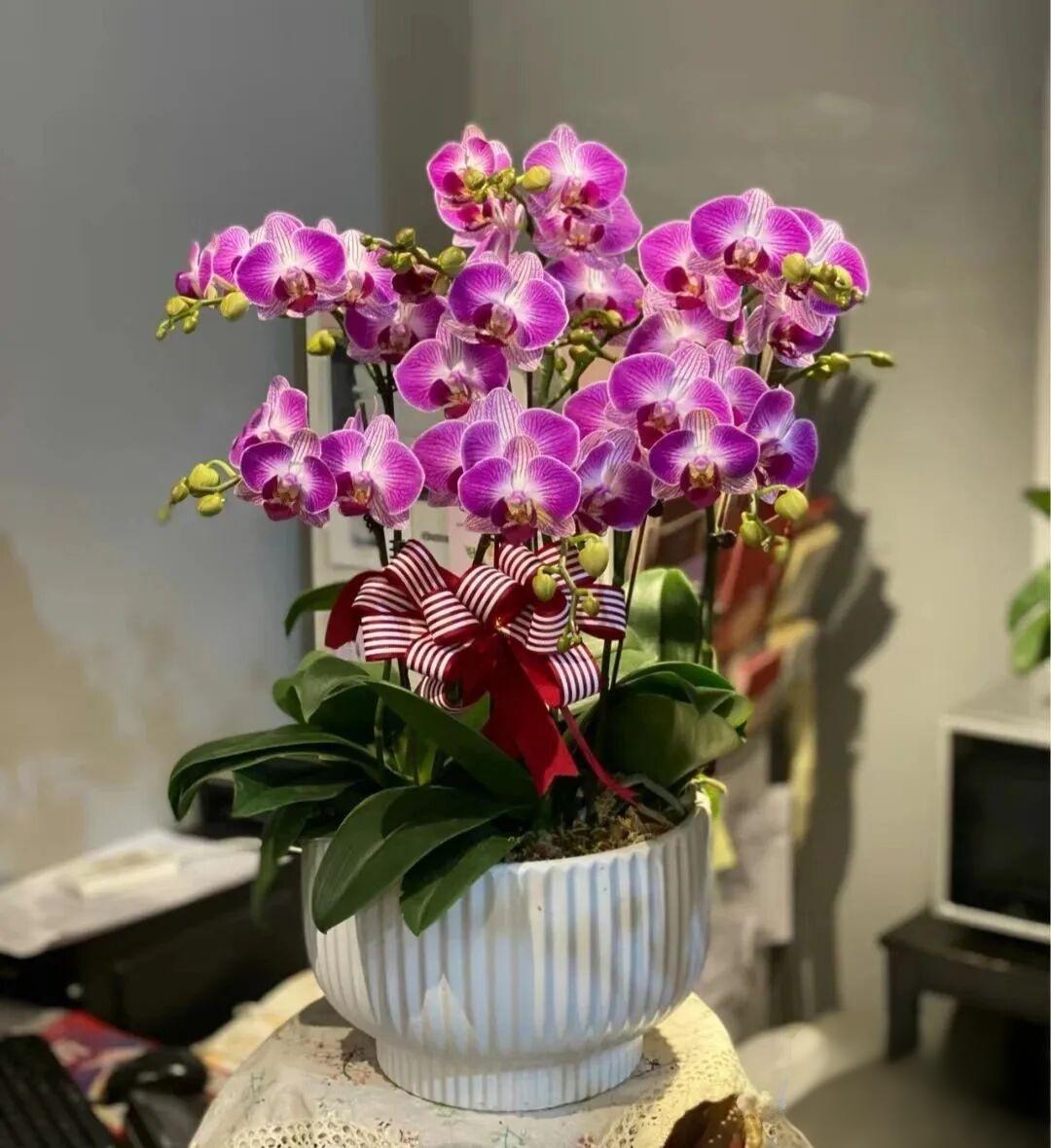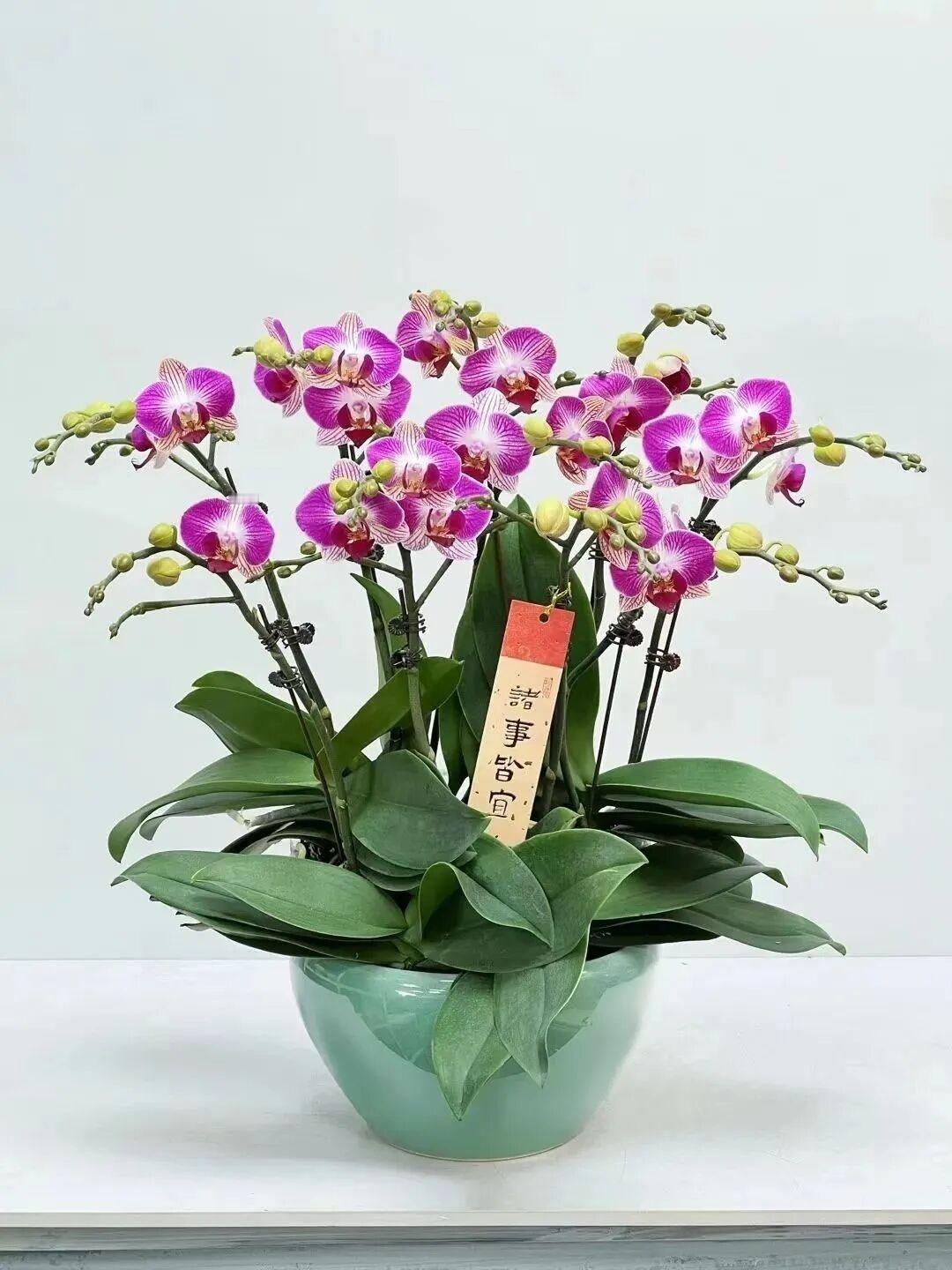 蝴蝶兰之美——天堂鸟 蝴蝶兰“天堂鸟”,又名“富贵鸟”,是年宵花中经典的高颜值品种,以独特羽纹花瓣尽显灵动气韵。纯白花瓣为底,深紫脉纹如翎羽舒展,边缘晕染浅粉柔光,花心紫红色唇瓣形似鸟喙轻啄,3裂造型搭配基部黄色肉突,细节精巧别致。 该品种株型小巧紧凑,茎短根系发达,常萌发双剑花葶,花序整齐昂扬,既兼具鹤望兰的飘逸仙气,又比其更显精致温婉。花朵直径约7厘米,属中花型,单枝陈设即可成景,置于桌面窗棂,紫白纹理在光影中若隐若现,恍如精灵停驻。 它适配18-28℃散射光环境,耐旱忌涝易养护,3年以上成株花期可达3个月以上。这份兼具吉祥寓意与适配都市环境的飘逸美,恰是方寸空间里最珍贵的“羽化”诗意,自摆赠人皆适宜。