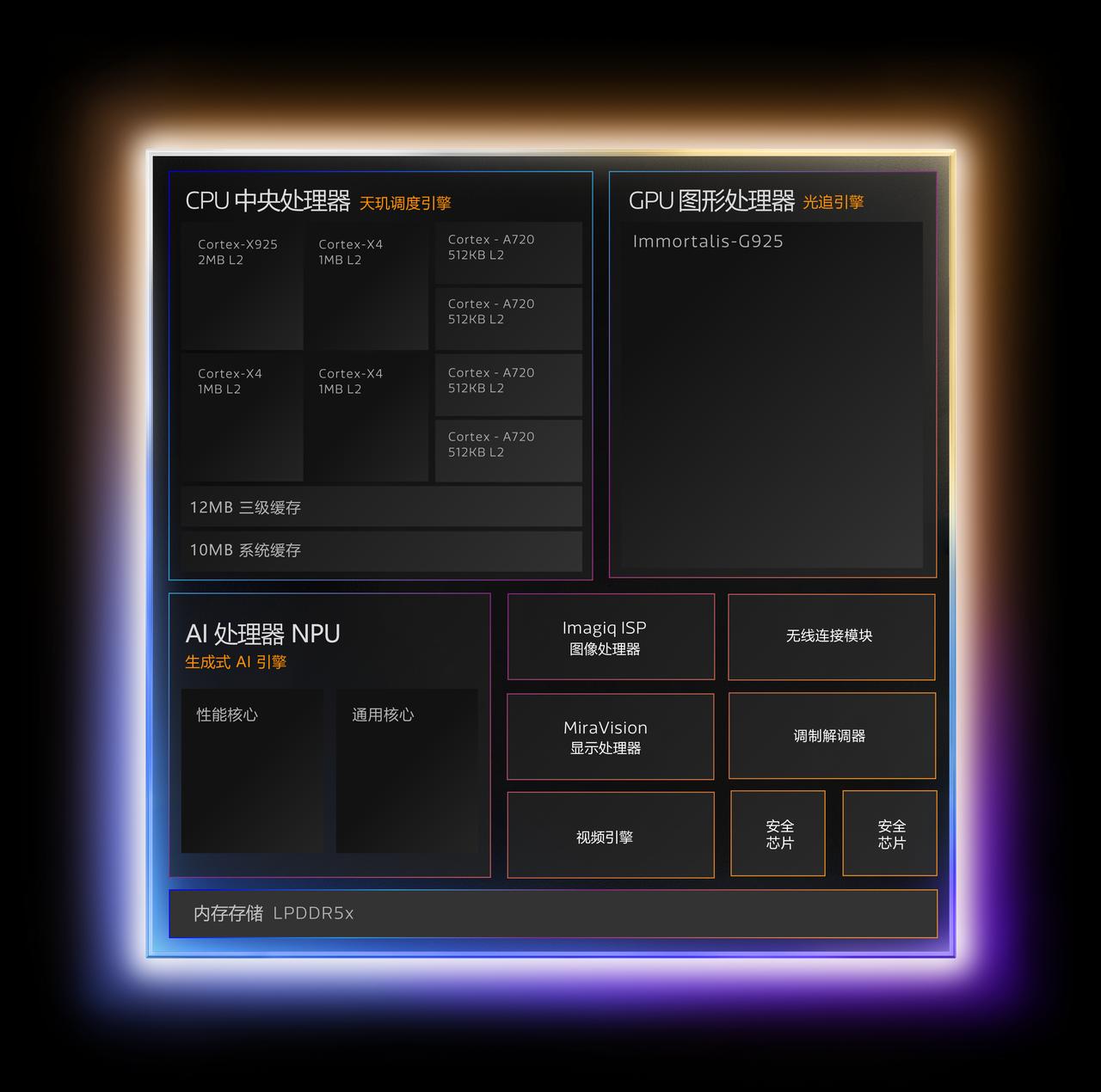 联发科天玑 9500s 正式发布,REDMI Turbo 5 Max 首发 - 制程:台积电第二代 3nm 工艺,291 亿晶体管; - CPU:1× 3.62GHz Cortex-X925(2MB L2)+ 3× 3.3GHz Cortex-X4(1MB L2)+ 4× 2.4GHz Cortex-A720(512KB L2),12MB 三级缓存 + 10MB 系统缓存; - GPU:Immortalis-G925 MC12 1.61GHz,相比天玑 9300,性能提升 40%,功耗最多省 45%,支持 3A 级光追技术 OMM 超光影引擎,Arm 精锐超分技术(功耗降低 27%),天玑星速引擎的自适应技术 3.0(MAGT 3.0)和天玑倍帧技术 3.0(MFRC 3.0); - 内存/闪存:支持 LPDDR5X 10700Mbps 内存,UFS 4.1 闪存; - APU 890:内置天玑 AI 智能体化引擎,天玑首发端侧 DiT(全新高画质技术)、天玑首发端侧 MoE,16X 长文本记忆能力,ETHZ AI Benchmark 6577 分,提升 2.86 倍,功耗降低 35%,硬件支持低位宽 KV 缓存技术,降低内存使用 50%; - 连接及其他特性:支持 R17 协议,功耗降低 18%,支持四载波聚合技术(4CC-CA) ,网络下行传输速率 7Gbps ;Wi-Fi 7 制程升级为 4nm,三频并发 7.3Gbps,游戏抗干扰能力提升 80%;Xtra Range 3.0,传输距离提升至 30 米;手机对手机蓝牙直连可达 5 公里;支持 12Mbps 384KHz 极高清音频,24bit 高清音频编码。
