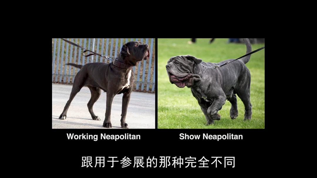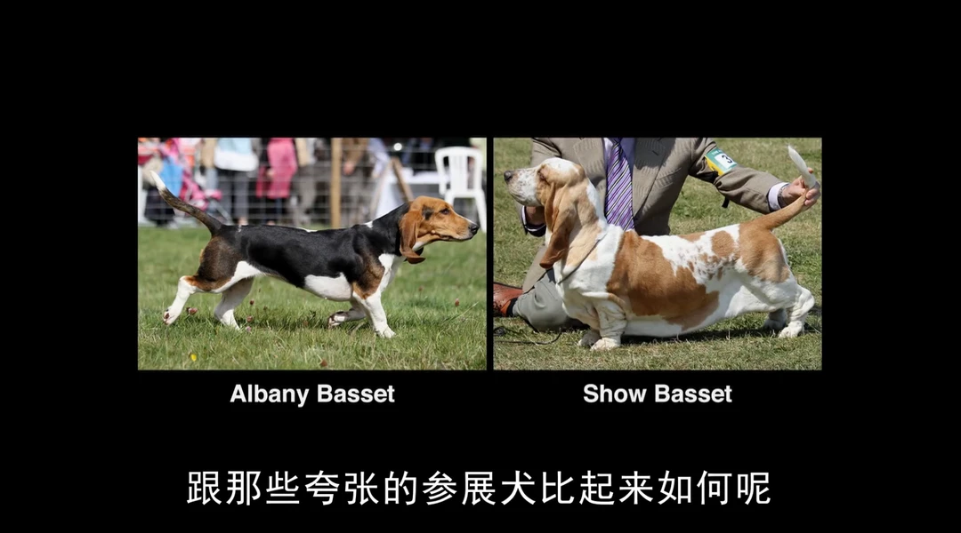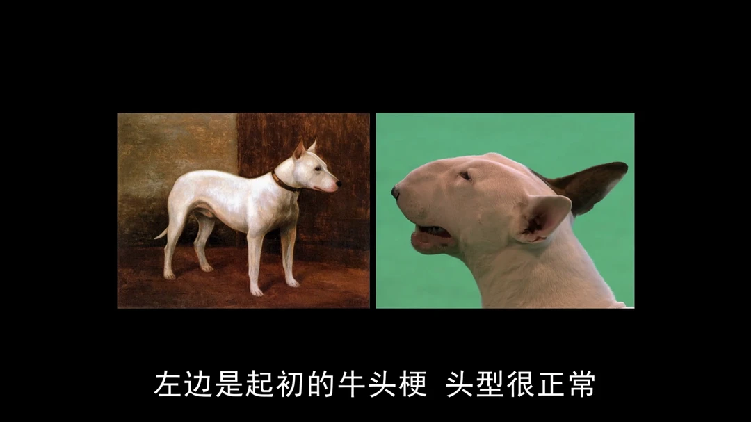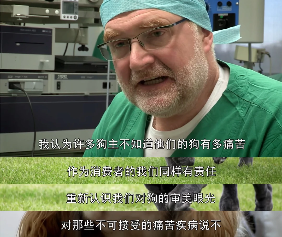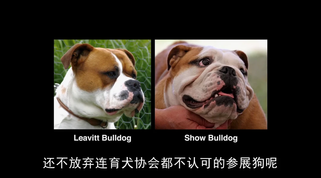截图来自第二部片子,看看一百年来,人类为了追求极端审美,对这些品种犬都做了什么!腊肠犬更短的腿、更圆的身躯,牛头梗更奇怪的头型,斗牛犬更扁的脸和更狭窄的呼吸道。明明呼吸,是一个生物最最基本的生存需要……