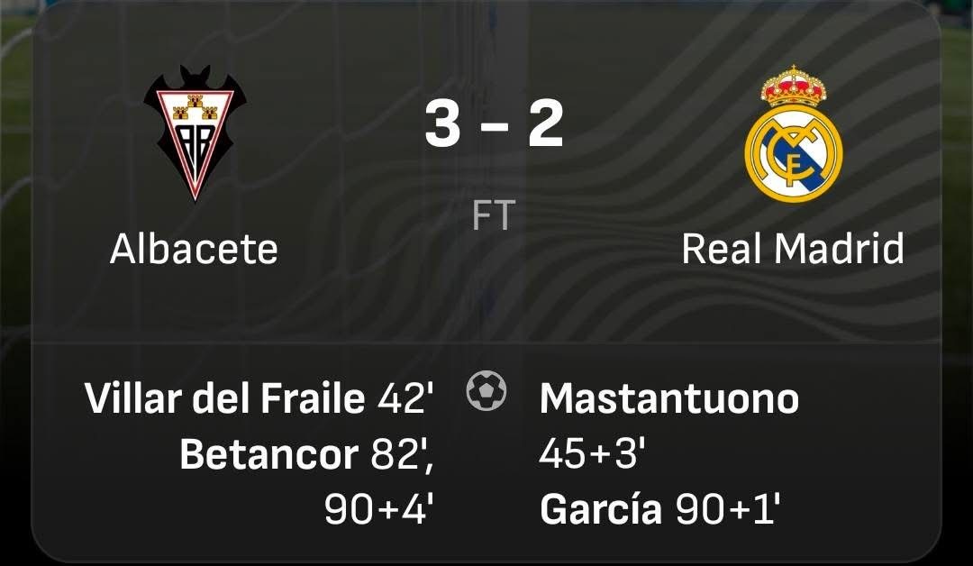 西班牙國王盃16強,皇馬換領隊即輸❗️❗️艾比路亞首度領軍,結果皇家馬德里作客2-3輸俾乙組嘅阿爾巴塞特被淘汰出局。西班牙國王盃第四圈賽事賽果-利安尼沙3-3(et: 0-1)畢爾包體育會拉科魯尼亞0-1 馬德里體育會皇家蘇斯達2-2(pk: 4-3)奧沙辛拿皇家貝迪斯2-1 艾爾切阿爾巴塞特3-2 皇家馬德里艾拉維斯2-0 華歷簡奴辛坦德體育會🆚巴塞隆拿(稍後時間進行)貝高斯🆚華倫西亞 🇪🇸🏆