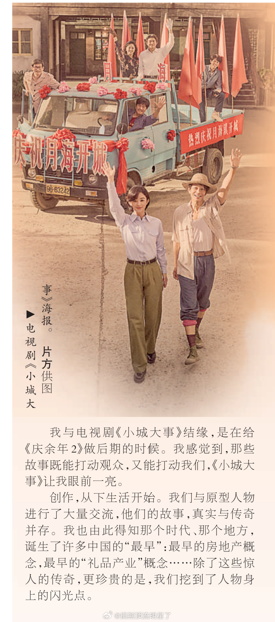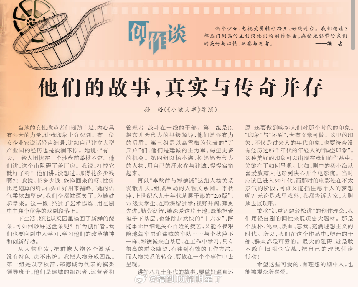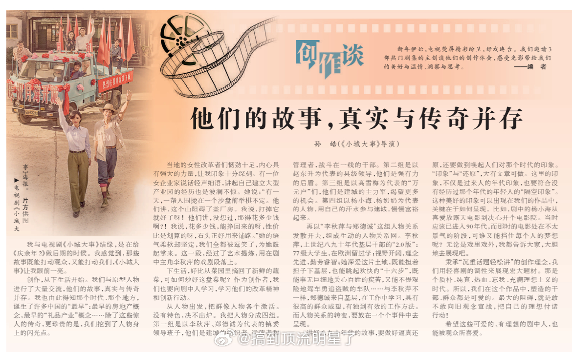 人民日报刊文《小城大事》孙皓——他们的故事,真实与传奇并存。秉承"沉重话题轻松讲"的创作理念,我们用轻喜剧的调性来展现宏大题材。那是个质朴、纯真、热血、忘我、充满理想主义的时代。所以我们在这个作品中,塑造的干部,群众都是可爱的。最大的阻碍,就是敢不敢向旧观念宣战,把自己的理想付诸行动!希望这些可爱的、有理想的剧中人,也能被观众所喜爱。小城大事