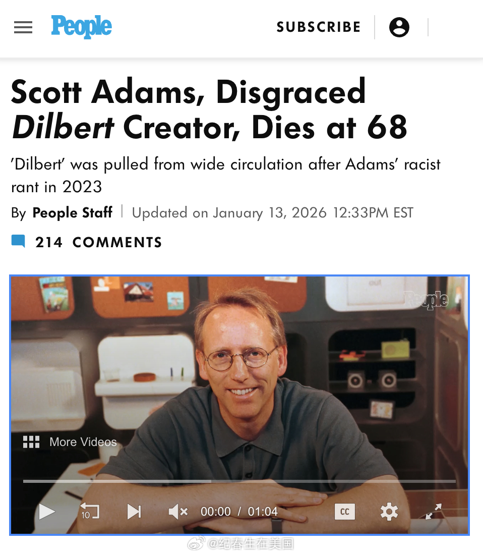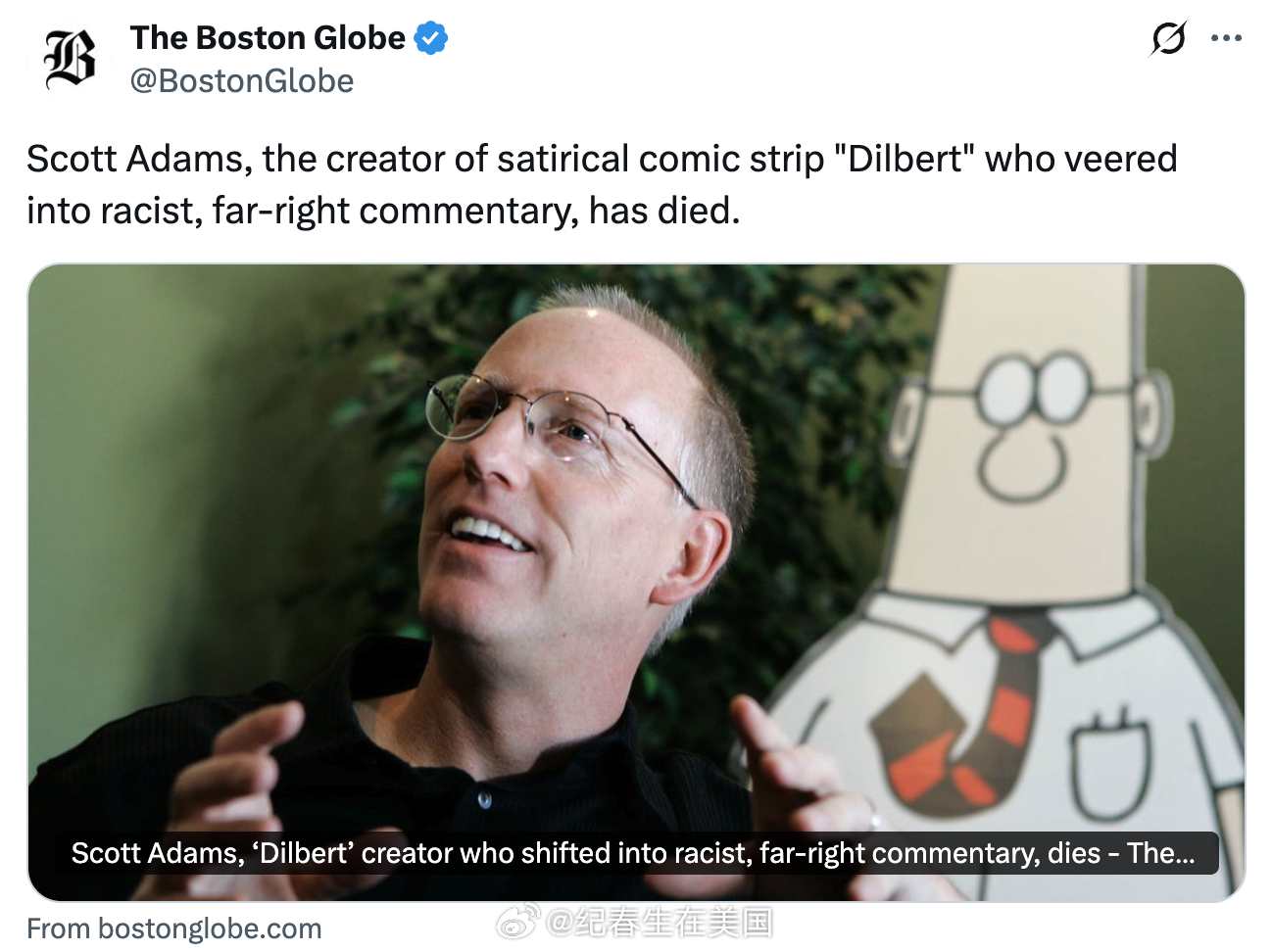 Scott Adams去世,左媒标题:: “种族歧视言论”: “不光彩的”:“发表种族主义极右翼言论”另外一些左媒讣告标题:查韦斯::“委内瑞拉总统查韦斯在抗癌斗争中逝世”卡斯特罗::“一位震撼古巴乃至世界的传奇人物”卡西姆·苏莱曼尼::“伊朗权力操盘大师”ISIS领导人巴格达迪::“清贫的宗教学者”