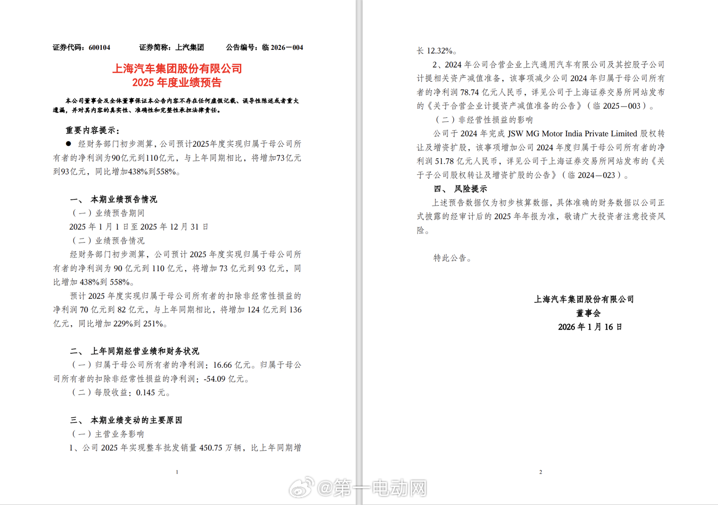 上汽集团 业绩报告:-预计2025年度归属于母公司所有者的净利润为90亿元到110亿元,同比增加438%到558%-扣除非经常性损益的净利润预计为70亿元到82亿元,同比增加229%到251%-销售整车450.7万辆,同比增长12.3%;其中新能源汽车销量达到164.3万辆,同比增长33.1%,创下历史新高
