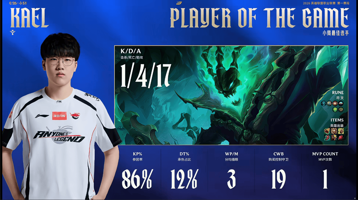 Kael锤石打出1/4/17战绩,斩获AL对阵IG第二局MVP