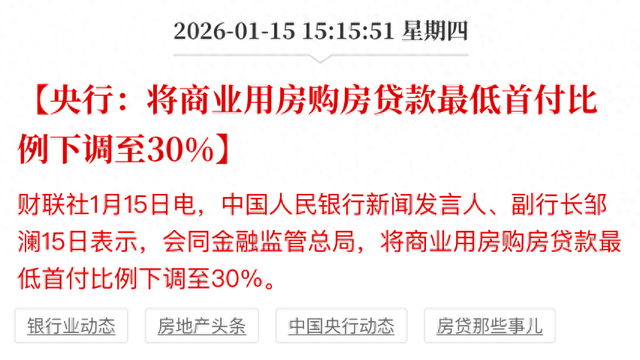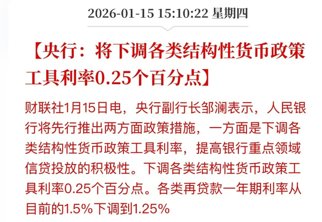 2026年1月15日,央行在国新办新闻发布会上抛出重磅利好,宣布下调各类结构性货币政策工具利率0.25个百分点,并将商业用房购房贷款最低首付比例降至30%。这两项政策组合拳的突然落地,不仅为持续调整的房地产市场注入强心剂,更向市场传递出精准发力稳增长的明确信号,引发社会各界广泛关注。在经济复苏进程中,此次央行官宣的政策红利,其背后的政策逻辑、对各领域的深远影响以及未来政策走向,值得深入剖析。