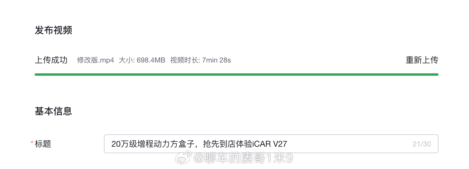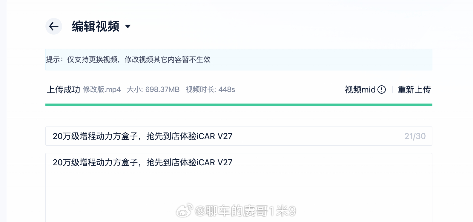 来聊聊作为创作者的使用体验上一条视频有修改的地方需要替换各大平台包括抖音视频号小红书B站以及门户网站,垂类平台大部分都是给一次视频替换的机会目前视频号没有,只能修改标题封面这也是去年10月才有的功能不过能看到后台一直在迭代升级剩下只有易车和百家号没有从运营角度以及这俩平台的流量来看他们可能已经放弃这块业务了赓言赓语我与汽车的日常