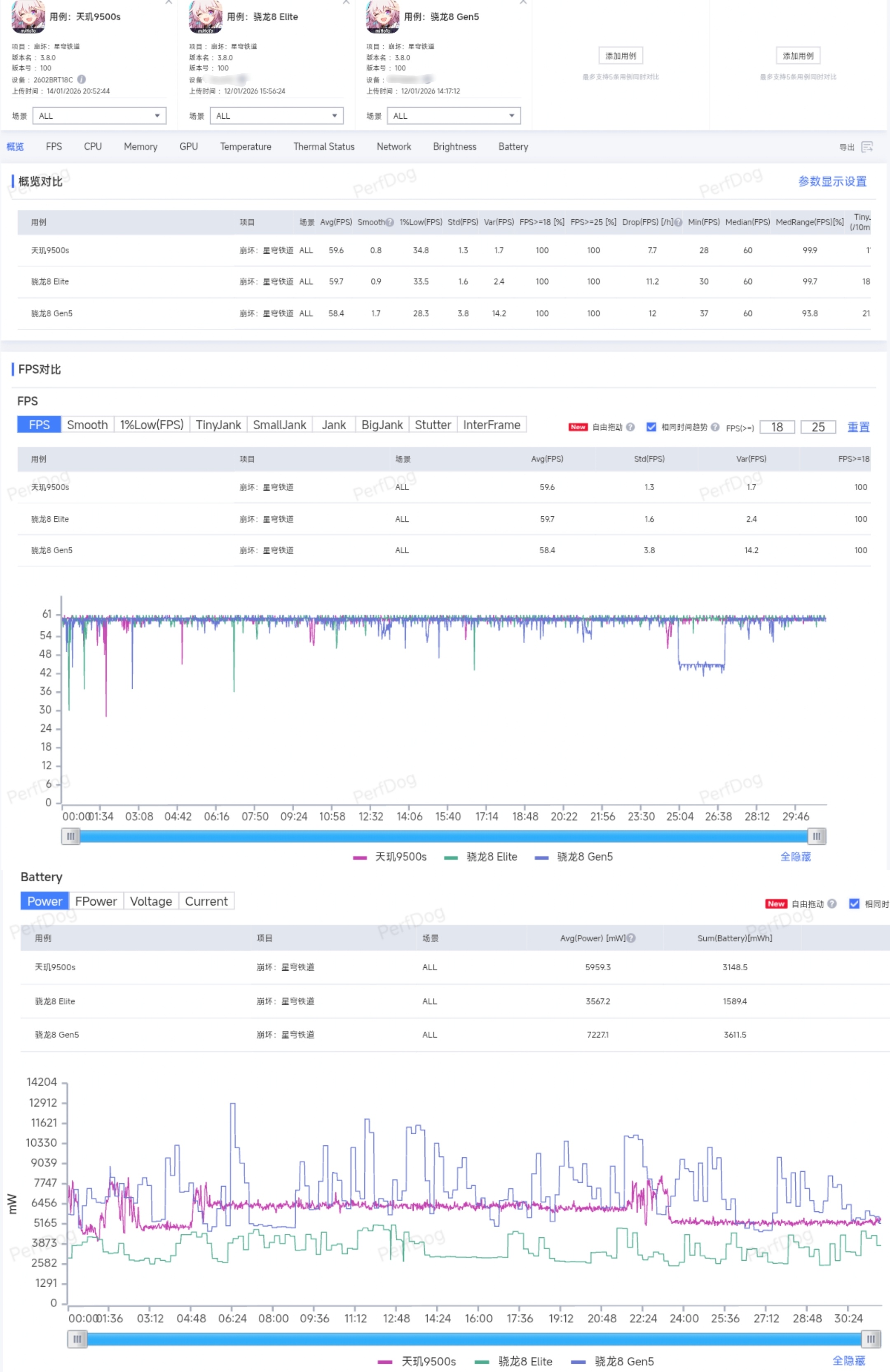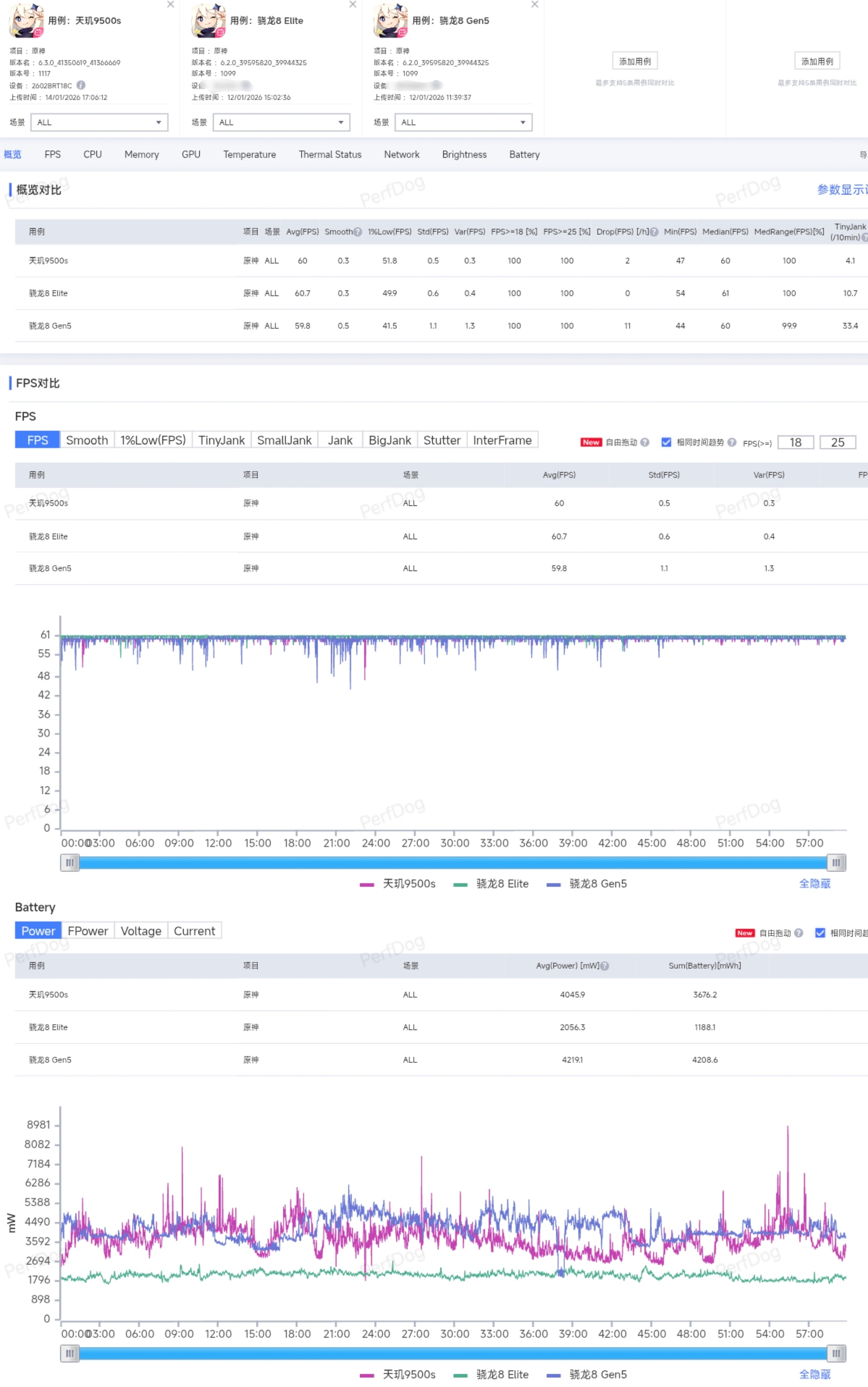 REDMI Turbo 5 Max & 天玑9500s性能实测:●首发天玑9500s,台积电N3e+全大核架构,3.73Hz主频+1.61GHz 12核GPU,L3 12MB,SLC 10MB,没有砍缓存,正统旗舰芯待遇;Turbo 5 Max还满配LPDDR5X Ultra+UFS 4.1,下面来一组实测。●《原神》全高画质测试中,Turbo 5 Max一小时长测平均帧数60FPS,功耗仅4W;骁龙8E和骁龙8G5同样表现不错,基本上都实现了满帧运行,但功耗是天玑9500s略胜一筹,1%Low帧也表现更好;《星铁》全高画质测试中,Turbo 5 Max平均帧数59.6FPS,功耗6W;在更吃GPU的大型游戏中,骁龙8G5砍缓存和GPU的劣势显现出来,游戏中后期出现发热锁帧现象,帧率波动更明显,平均帧数58.4FPS,功耗表现也不及天玑9500s;《王者荣耀》极致120帧模式下,Turbo 5 Max一局游戏平均帧数120FPS,功耗3W±,发挥了天玑一贯的低负载能耗优势,领先于竞品骁龙8E/8G5机型。简单来说,REDMI Turbo 5 Max这颗天玑9500s更符合大家理想中的旗舰定位,满配缓存和GPU规模,提供了更稳定持久的性能释放。关键是目前测下来,这机子续航表现也很亮眼,巨容量电池上大分,给12月初至今这批大电池性能机再上上强度Turbo5Max性能首发评测Turbo5Max性能天花板
