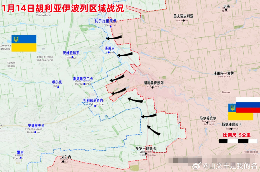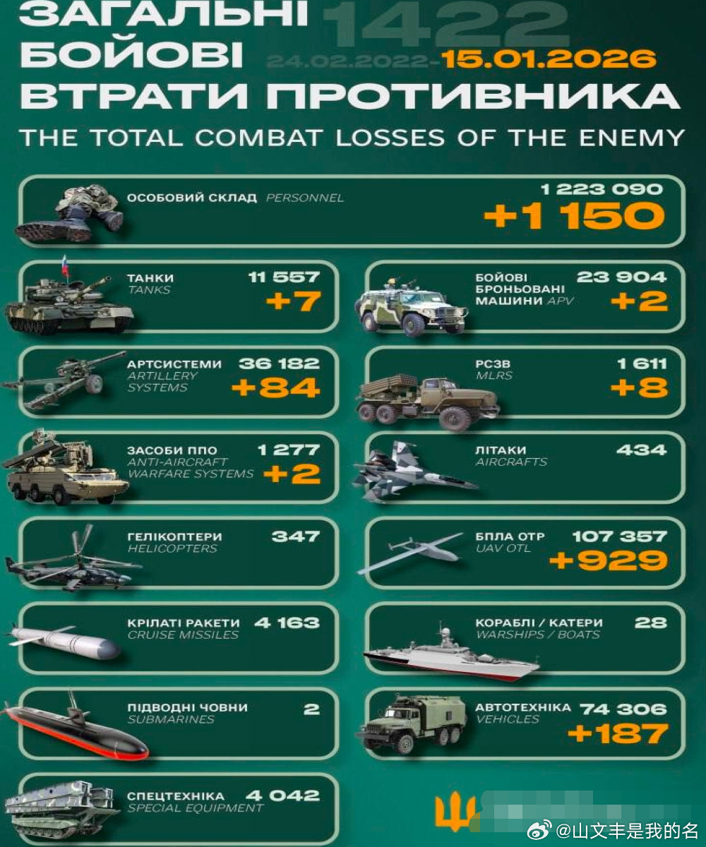 乌俄战争日报第1422天1月14日,乌无人系统部队在过去48小时使用战斗部重量超过10千克的中型无人机,摧毁了位于顿涅茨克和扎波罗热的6个俄军防空系统,分别是:顿涅茨克州马里乌波尔区的“道尔”防空导弹系统、S-350防空系统使用的“维佳兹”50N6E雷达站和该州沃尔诺瓦哈区的“山毛榉-M1”防空系统;以及扎波罗热州波洛希夫区的“山毛榉”防空系统、“箭-10”防空系统、“道尔-M2”防空系统。乌俄战争进入第1422天,乌克兰总参谋部发布战报:过去24小时乌俄双方交战118次,其中34次在胡利亚伊波列(11次在苏梅)、15次在托列茨克、11次在莱曼、39次在波克罗夫斯克、8次在南顿涅茨克区域。毙伤俄1150名。俄军累计损失1223090人。摧毁俄7辆坦克、2辆装甲车、84门火炮、8个火箭发射装置、2套防空系统、929架大型无人机、187辆军车。