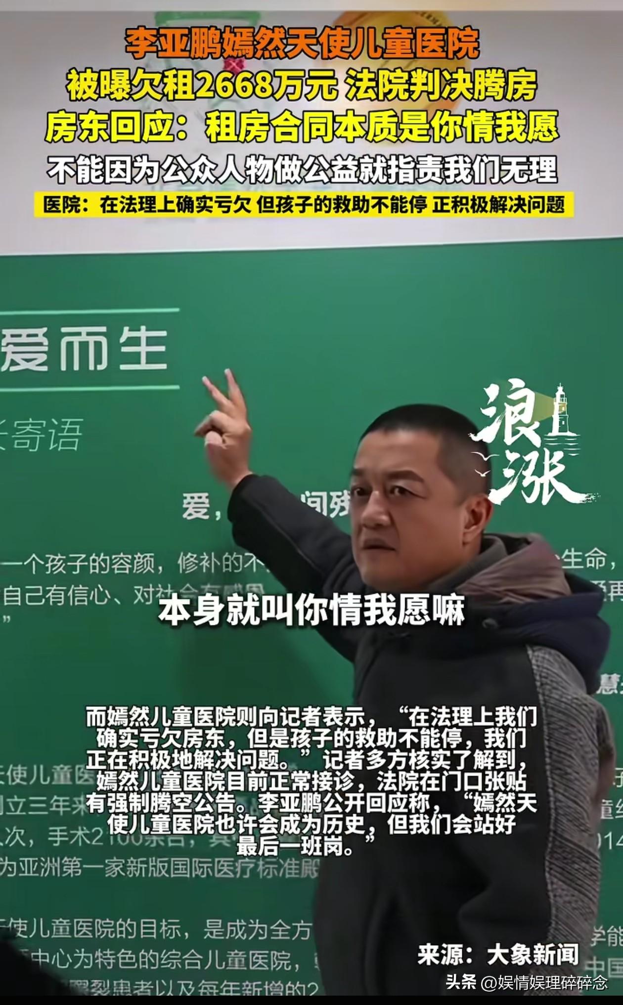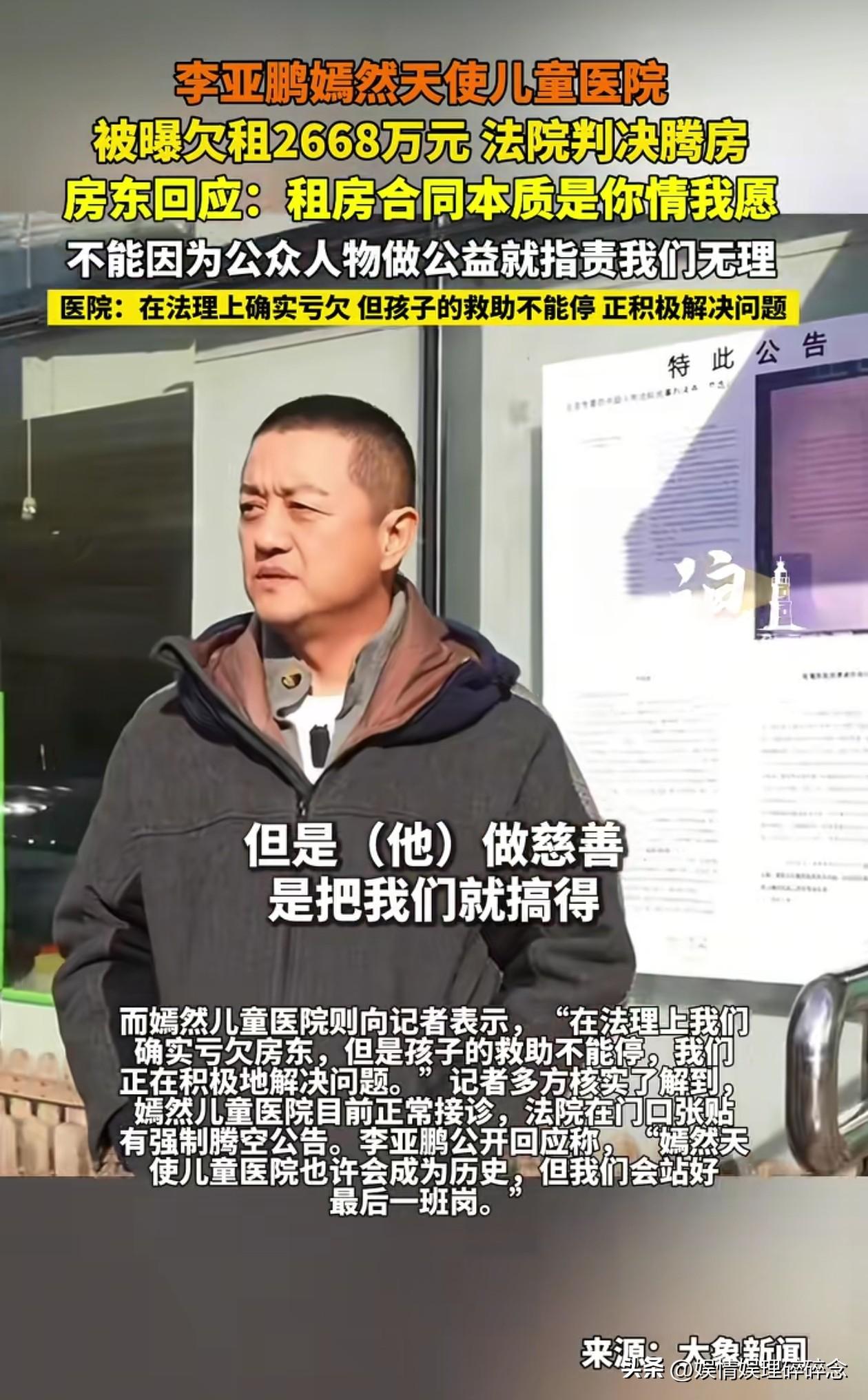 李亚鹏用30分钟的视频讲述了嫣然儿童医院的故事,而房东仅用一句话进行了回击。他说:“本质来讲,他(李亚鹏)是受益方,我们就像东郭先生。” 房东张先生是一位年近七旬的香港居民,当时出租时,也是看在明星效应和公益事业,第一个十年收了李亚鹏低于市场价一半的租金,并说好了以后会涨租。 当第一个十年租约满了之后,房东将租金回调到市场价格。张先生认为,李亚鹏只提涨租,而不说前十年的“特价租金”,导致现在网络上有部分网友认为房东坐地起价,是“黑心房东”。 据悉嫣然儿童医院从2022年起就开始拖欠租金,这期间每月两万多元物业费,还有水电等费用,都是由房东在交,所以,李亚鹏其实是受益方。 如今,事已至此,法院也判了,医院的招牌也拆了,李亚鹏说自己也和自己和解了,只求站好最后一班岗。 李亚鹏建嫣然医院的初心是真的,帮了上万唇腭裂孩子也是事实。而房东大爷前十年半价租给他,也够仗义了。只是三年特殊时期一来,很多事就由不得人了。 有时候人就像棋盘上的子,走一步看一步,以为能掌控局面,其实还是被大局推着走。李亚鹏想坚持情怀,房东也想拿回合理的市场价,谁都没错。情怀很动人,公益也很高尚,可现实里合同就是合同,义务就是义务,不会因为你的初心好,就能绕过该承担的责任。 我们普通人又何尝不是这样?拼命工作、认真生活,可还是会遇到突如其来的变化,计划赶不上转折,理想碰见现实也得低头。很多时候只能叹一句:造化弄人,尽力就好。 李亚鹏