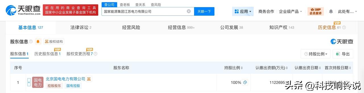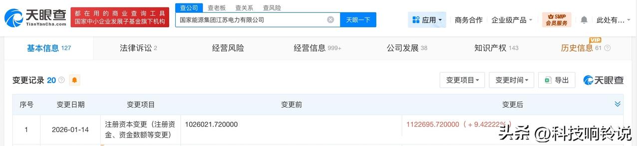 【国家能源集团江苏电力增资至112.3亿 增幅约9%】 天眼查工商信息显示,近日,国家能源集团江苏电力有限公司发生工商变更,注册资本由约102.6亿人民币增至约112.3亿人民币,增幅约9%。 该公司成立于2008年12月,法定代表人为赵宏兴,经营范围含以自有资金从事投资活动、自有资金投资的资产管理服务、煤炭及制品销售、信息技术咨询服务、光伏设备及元器件销售、电气设备修理、再生资源销售、检验检测服务等。股东信息显示,该公司由北京国电电力有限公司全资持股。 天眼查信息: