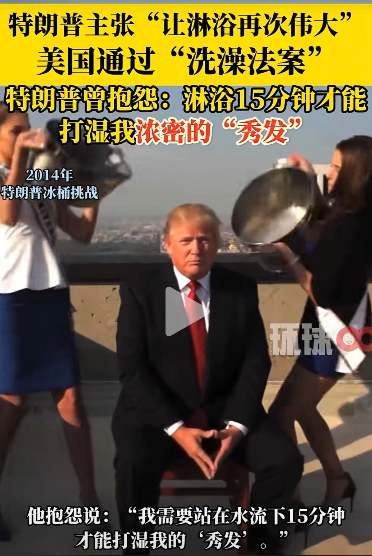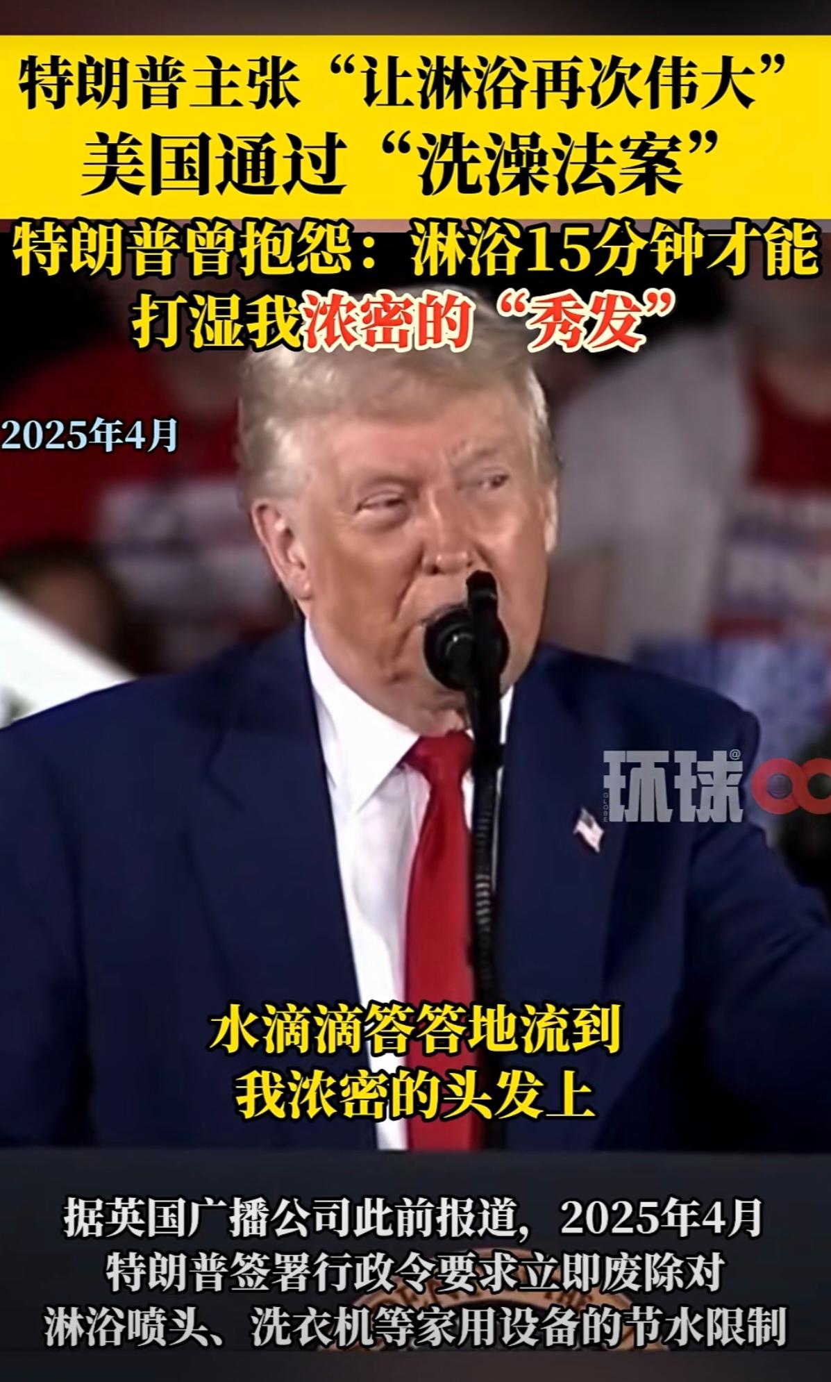 特朗普终于可以痛痛快快的洗澡了!没想到,美国还有这么奇葩的法案:“洗澡法案”(能源法)!居然还限制用于洗澡的淋浴喷头的水流量。(应该也是水压大小) 现在淋浴喷头都是有节能开关装置的。你想节水,就选择节流档位,想淋浴舒服,就选择大流量档位。这个完全可以自己选择的,没想到居然还需要立一个法案。 估计特朗普是喜欢,大水流量档位的,所以他开始推动通过这个“洗澡法案”。看来淋浴15分钟才能打湿头发的喷头,已经不能适应川普了。 所以才有了特朗普主张的“让淋浴再次伟大”的提案。要不是看到新闻,还真不知道,美国居然连洗澡都有相关限制的法案。 这回好了,美国通过了“洗澡法案”,取消了对淋浴喷头的水流限制,特朗普终于可以痛痛快快的洗澡了。