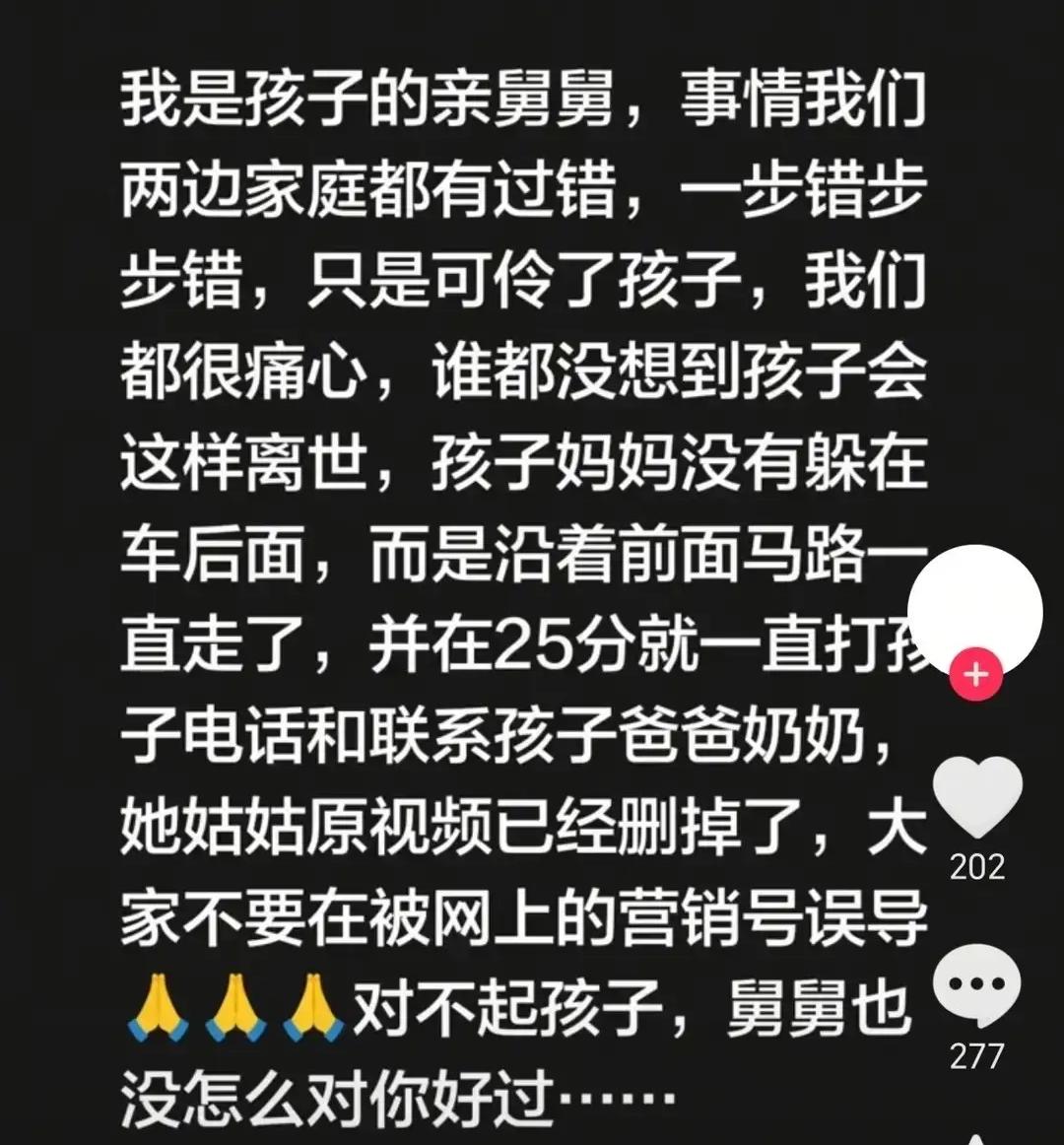 哭着找妈妈的9岁女孩本不该离世,了解全过程愈发的感觉这是一场本不该发生的意外。 事发前她的妈妈已经哄了她一个小时,此时的小女孩情绪比较激动,随时会发生意想不到的事情。 妈妈只是认为她是一个孩子,却没有真正的了解她对母爱的渴望,认为只要是自己离开了,她哭够了闹够了,见不到妈妈了就会乖乖的回家了。 事发中,也有人路过,也有人观望,如果有爱心的人能够停下来,问一下小女孩哭的原因,再用电话手表给爸爸打一个电话,或许悲剧也不会发生。 女孩的妈妈并不是没有给开麻将馆的前婆婆打电话,电话无人接听,又打到了前夫那里。女孩爸爸从电话手表看,她已经回到家了,并没有打电话确认女儿在没在家。 女孩的舅舅说两边都有过错,一步一步错,导致可怜的孩子因心源性死亡,真的是太可惜了。 父母离婚没有错,既然两人无法继续生活在一起,对孩子也是一种伤害。但错就错在,双方的粗心大意,认为孩子9岁了长大了,懂得其中的道理了。 有时候真的就是这么巧,你认为不会发生的事情偏偏发生了,这些偏偏发生的事情如果能上心一些,可能就完全避免了。 作为家长,此时的心情已无法用文字表达,已语无伦次,希望这样的悲剧不再发生,小女孩一路走好。