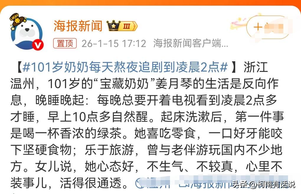 我的天呐,这真的是厉害了,1月15日热搜,101岁奶奶每天熬夜追剧到凌晨2点。 这真的是比我还能熬啊。 但是睡得还是比我多,因为她要睡到早上10点,我只睡到六七点就起床了。 让我羡慕的是她的牙,还非常的好,没有坚硬食物,如果我有幸能活这么久,我要是到她这岁数了,那估计牙都没了。 老太太的心态特别好,不喜欢生气,不较真。 心态特别的重要。
