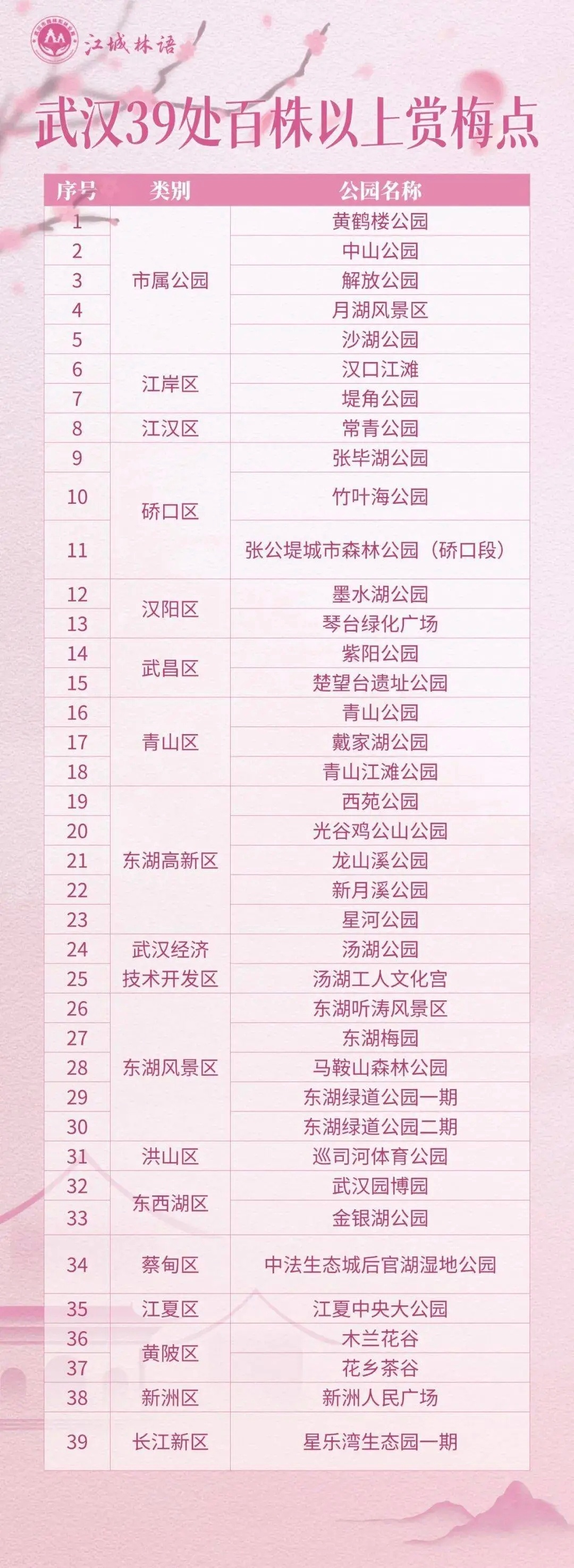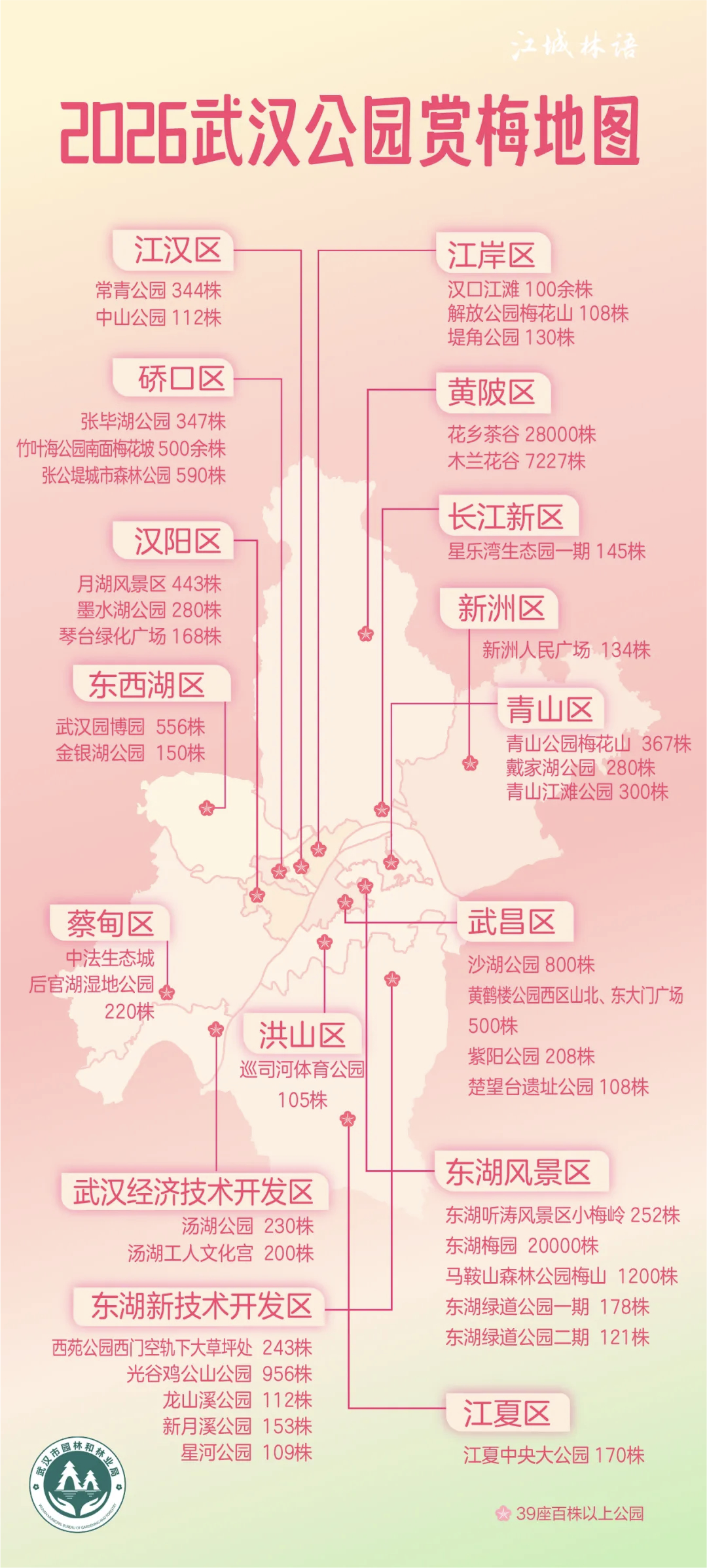 粉色花海,即将开遍武汉!1月14日武汉市园林和林业局正式发布2026年赏梅地图,全市116座城市公园被标注为赏梅好去处。较2023年新增32座,数据显示其中39座公园种植梅花超百株,10座公园梅树数量超过500株。赏梅地图显示,这116座公园中,种植百株以上梅花的有39座。其中,10座公园梅花数量超过500株,形成规模化花海景观。 市园林和林业局相关负责人介绍,近年来结合城市更新与“湿地花城”建设,武汉每年新建及改建公园百余座。在新公园建设、老公园提升过程中,园林部门有意识地增植梅花,以强化“冬观梅”的城市四季花卉特色。东湖梅园以360种梅花品种高居全市榜首,堪称“梅花博物馆”。园内现有梅花2万余株,今年因气候适宜,花期大幅提前,已于元旦对外开放。目前园内梅花开放约三成,红、白、粉、绿各色交织,游客可同时观赏梅花与蜡梅。园内藏有多个百年以上古梅桩,其中一株树龄超过300年的雪梅,已进入盛花期,花朵繁密,远望如雪覆枝头。除东湖梅园外,黄陂区木兰花乡茶谷景区拥有320种梅花,位居第二;青山公园“梅山香雪”景点汇聚48个品种,是免费公园中品种最丰富的。 以数量论,黄陂区木兰花乡茶谷景区以2.8万余株梅花,成为全市最大的梅花花海。东湖梅园则以2万余株位列第二。在免费开放公园中,马鞍山森林公园梅山拥有1200株梅花,规模最大。目前仅少量开放,盛花期预计在春节前后。硚口区竹叶海公园的“梅花坡”今年率先进入盛花期,上个双休日接待游客近万人,成为免费景点中的“人气王”。 随着赏梅季到来,各公园已增加安保和保洁人员,引导游客文明赏花。部分公园还将在赏花区域组织市集、音乐会等文化活动,丰富游客体验。 近年新建的新月溪公园、星河公园等,植梅均在百株以上。汉阳龙阳湖公园一期、洪山毛坦公园、经开坛山湿地公园等地,均成片种植了梅花,形成新景观。 老公园的“微更新”也融入巧思。黄鹤楼公园在跨鹤亭旁采纳专家建议,以“品”字形种植红梅,衬托古亭之美,现已成为热门打卡点。关山荷兰风情园2023年采纳市民建议,补种10株梅花,如今已成园内亮点。沙湖公园、南湖幸福湾、琴台绿化广场等地梅花相继绽放,与城市天际线、轨道交通构成独特画面。园林部门建议市民收藏赏梅地图,根据花期、天气合理安排行程,避开人流高峰,捕捉梅花最美瞬间。 “春赏樱、夏观荷、秋品桂、冬观梅”,四季“花旦”在武汉轮番登场。随着“湿地花城”建设的推进,市民身边的赏梅地图仍在不断拓展更新。转发分享给您关心的人一起相约赏梅吧~来源:湖北日报(记者 杨文漪 通讯员 江林语)编发:沈祯卓 喻思薇 实习生 罗月笛审核:方军出品:湖北日报融媒体中心热点观点用智搜看懂微博