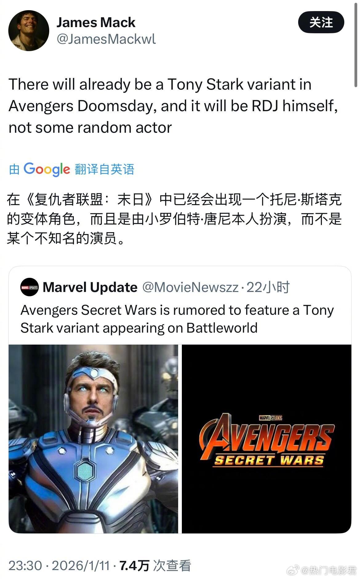 小罗伯特·唐尼一人分饰两角?钢铁侠回归🎉据消息,小罗伯特·唐尼要强势回归漫威宇宙了!而且这次不是简单的客串——他将一人分饰两角!l 全新反派毁灭博士l 钢铁侠变体也就是说,我们很可能在电影里看到“两个唐尼”同框?这简直是双厨狂喜!这选角脑洞我服了!既给了粉丝一个情感上的“重逢”,又开启了全新的故事可能。钢铁侠变体和毁灭博士之间又会有什么炸裂的互动?想想就激动到不行!