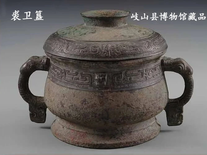 1975年2月2日,陕西省岐山县京当公社董家村的农民在村西农田进行基本建设时,意外发现了一个青铜器窖藏。他们立即保护好现场,并报告给了陕西省文物管理委员会岐山扶风考古工作站。考古工作者迅速赶到现场,进行了清理发掘。岐山董家村窖藏共出土青铜器37件,包括鼎13件、簋14件、壶2件、鬲2件、豆2件、盘1件、盉1件、匜1件、鎣1件。这些青铜器大部分收藏于岐山县博物馆。 这批铜器中有30件铸有铭文,内容丰富,涉及多个问题。器主十余人,他们之间的血亲及世代关系虽然一时难以具体排定,但多数人当属于裘卫同一家族的成员无疑。在裘卫家族铜器中,时代最早的当属卫簋,作于穆王二十七年,即公元前950年。有明确纪年、时代较晚的可能是此鼎类,为宣王十七年器,即公元前811年。裘卫家族主要活动于西周中晚期,时间跨度近一个半世纪,是西周中晚期较有影响的一个贵族世家。 今介绍董家村窖藏中的裘卫簋,该器通高23厘米,口径22.6厘米,腹深11.4厘米。裘卫簋造型典雅,为侈口,圈足,盖冠作圈状,长舌兽首耳搭配珥饰,下腹微微向外倾垂。纹饰方面,颈部饰以云雷纹填地的窃曲纹,云雷纹作为底纹,每一组窃曲纹之间用兽头相隔,颈部下方一道阳弦纹,盖上的窃曲纹与颈部相呼应,圈足饰弦纹一道。 裘卫簋铭文,器、盖同铭,各铸有内容一致的铭文七行七十三字。 铭文释文:隹廿又(有)七年三月既生霸(魄)戊戌,王在周,各(格)大(太)室,即位。南伯入右裘卫入门,立中廷,北卿(向),王呼内史赐卫缁巿、朱黄(衡)、銮。卫拜稽首,敢寻扬天子丕显休,用作朕文祖考宝簋,卫其子子孙孙永宝用。 铭文大意:周穆王二十七年三月上旬戊戌日,周王在宗周,来到太室,就座。南伯陪同裘卫进门,站在大庭中间,面朝北方。周王命内史赏赐给裘卫黑色围裙、朱红色带子,以及车上用的铃铛。裘卫拜谢、叩头,并颂扬天子显赫的恩赐,制作用来祭祀祖父和父亲的宝簋,希望裘卫子子孙孙永远珍藏使用。