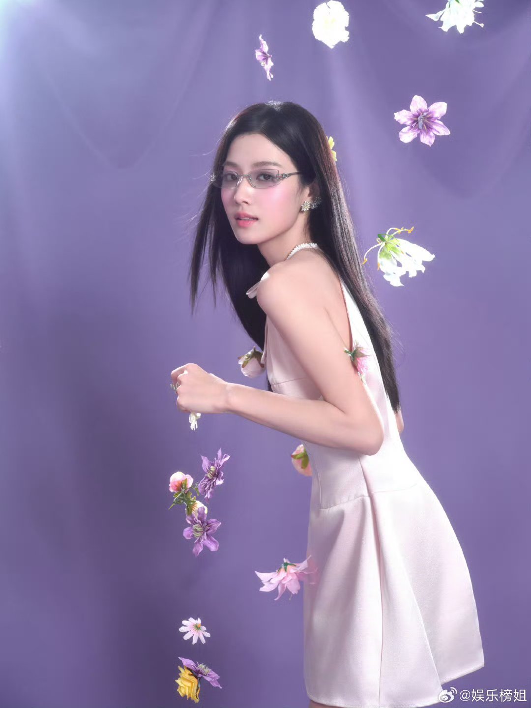 景甜这一身造型精准拿捏“温柔高级感”,粉雾色低饱和色调自带柔光滤镜,抹胸设计搭配