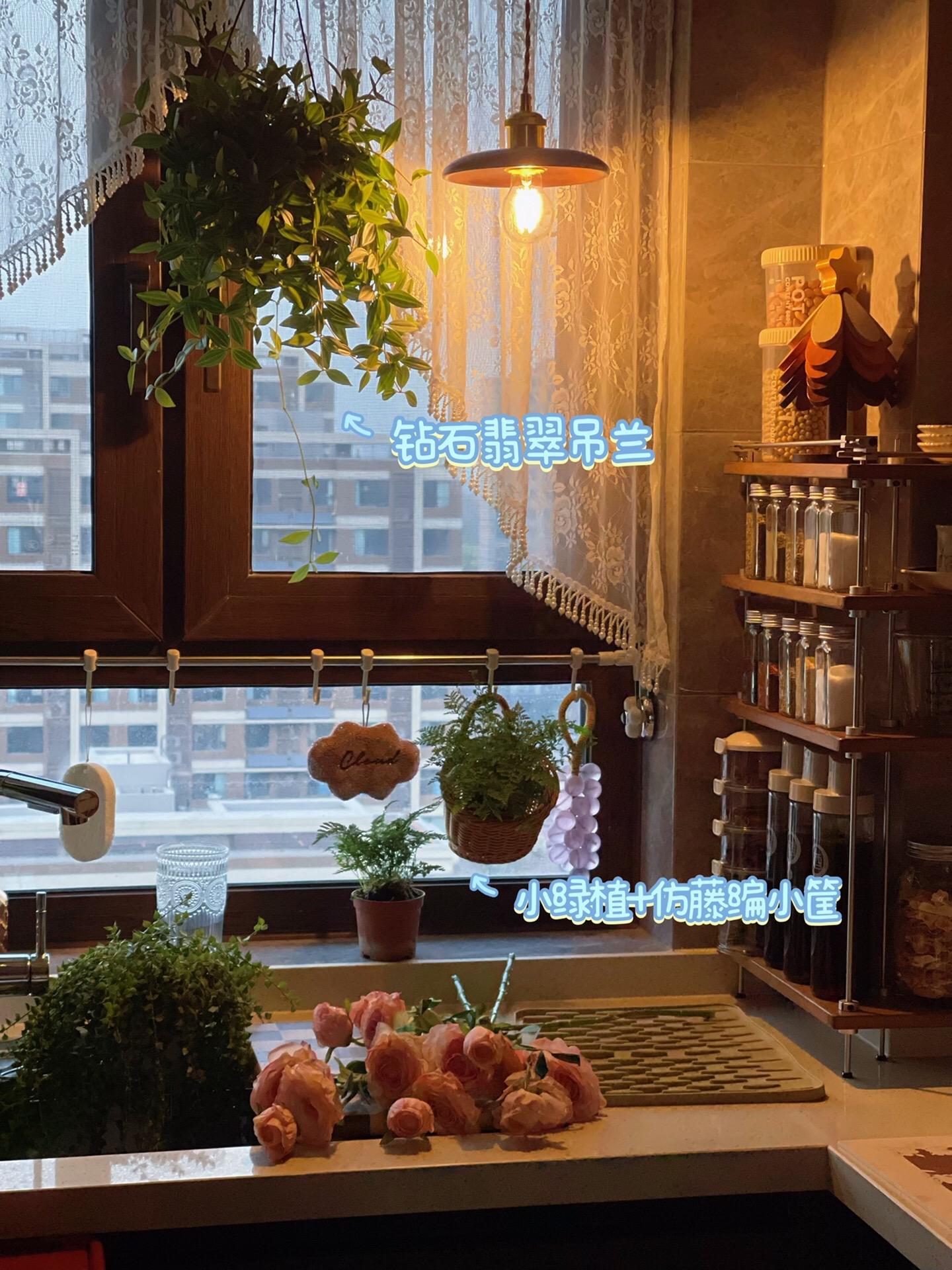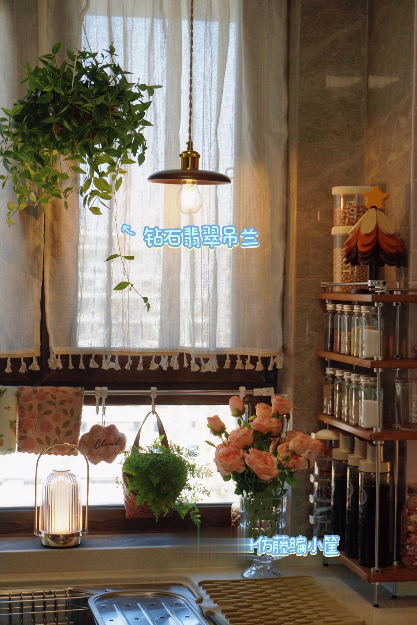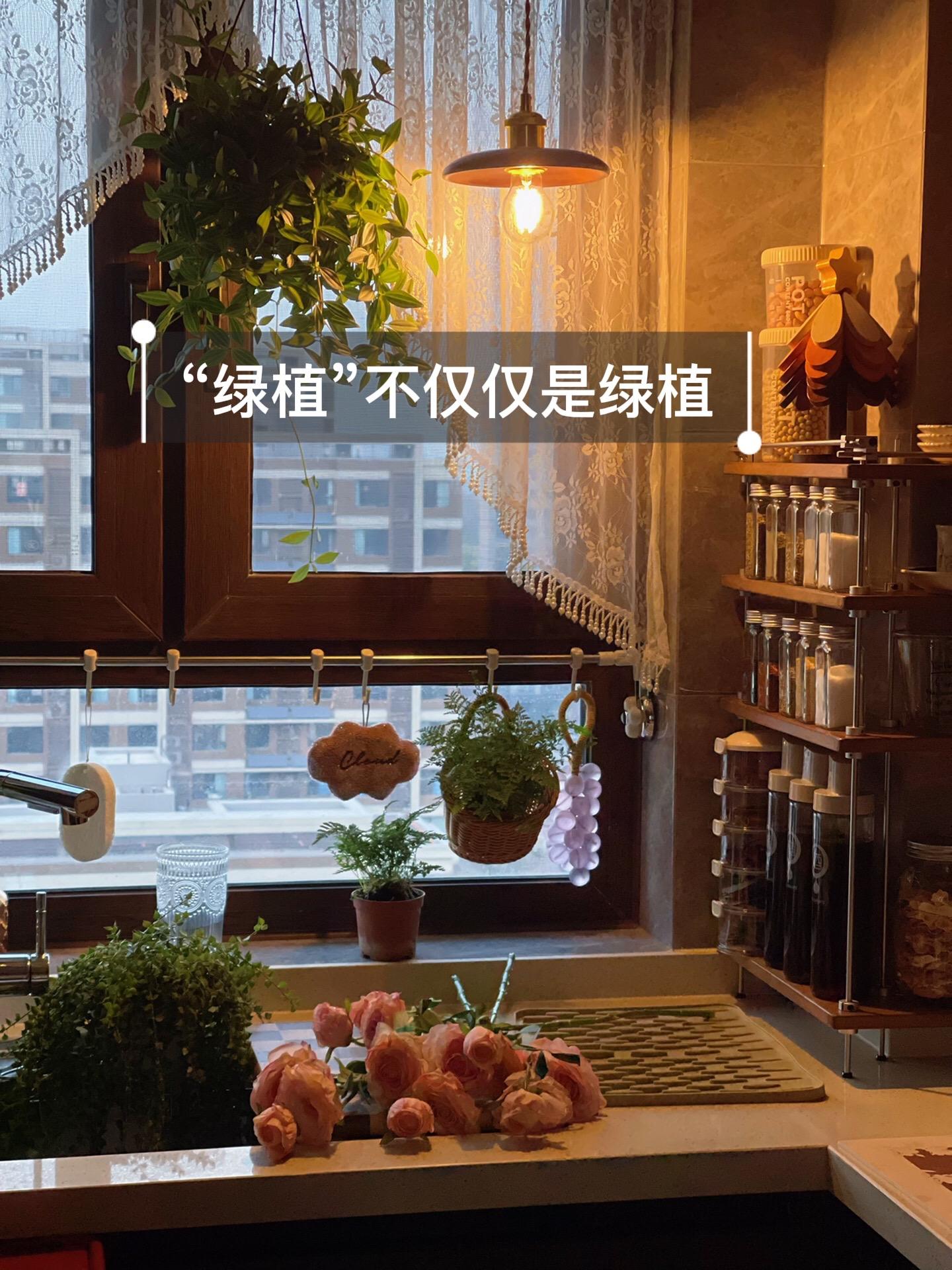 我的厨房氛围神器非“绿植”莫属。绿植一直都是一个空间的氛围神器 是点睛之笔 如果养不好绿植 是不是也可以有办法给空间增添活力呢 比如一些绿植挂画 仿真花 绿植钟表、摆件 绿植的擦手巾也是不错的选择呢 实用和颜值兼具 ·厨房绿植几种氛围搭配 垂吊类绿植➕纱帘 置物隔板➕垂吊类绿植 绿植➕法式瓷罐 垂吊类绿植➕实木复古吊灯