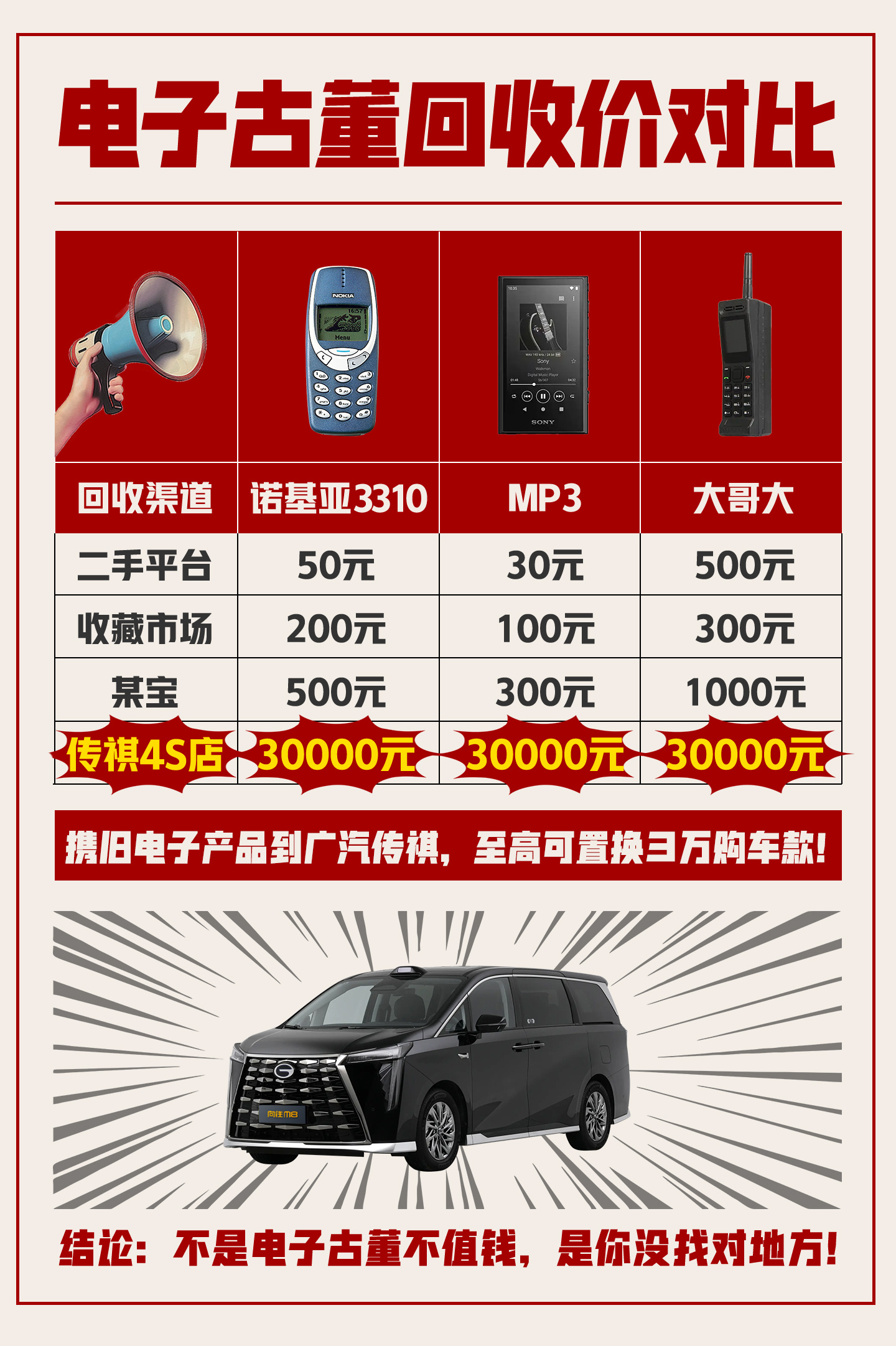 谁能想到,压箱底十多年的老诺基亚,在广汽传祺门店里焕发了新价值。最近,广汽传祺推出的携旧电子产品到店可至高置换3万购车款的活动挺有意思,让那些承载着青春记忆的电子古董(MP3、学习机、游戏机等等),不再是落灰的废品,反而成了兑换权益的硬通货。传祺这波操作,不止是置换,更是给了一代人的青春一个实实在在的价值回响。男子用15年前诺基亚抵3万购车款
