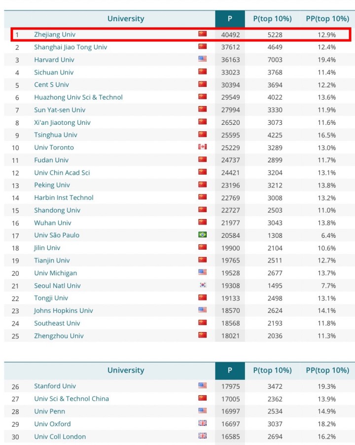 刚出炉不久的2025榜单就显示出这一特点。排第一的就是纽约时报作者特意提及的浙江大学,排名前10的大学有8家来自中国,美国哈佛排在第三,加拿大的多伦多大学名列第10。