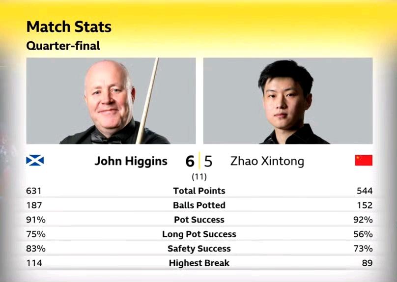 今晚希金斯的运气无敌!6-2玄学结束,希金斯6-5绝杀赵心童晋级大师赛四强。 真的意难平,就差一个红球,就差一点点运气。本届大师赛最精彩的一局,本以为能给老头熬下来,没想到希金斯今晚直接无敌了。 两人从1-1打到3-3,随后赵心童连胜两局5-3先拿到赛点。 希金斯赢下第9局,第10局运气开始附身,将比赛拖入决胜局。 决胜局,希金斯先上手然后中断,随后赵心童单杆53分,但进攻最后一个红球失误,希金斯清台拿下比赛。